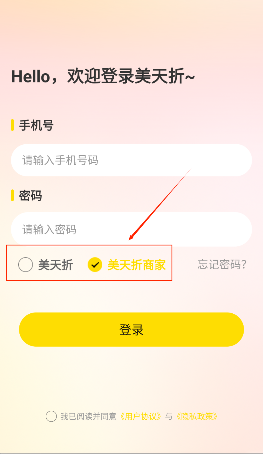 4、登录后可以在个人中心切换用户类型,并且可以选择美天折或商家模式来匹配不同的使用需求和功能权限哦。