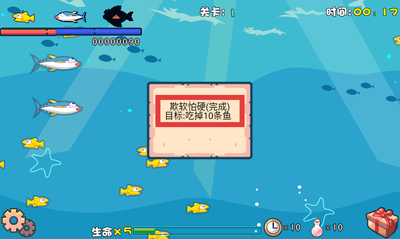 4、完成【欺软怕硬-吃掉10条鱼】任务,优先攻击弱小鱼类,达成目标解锁后续挑战,巩固基础。