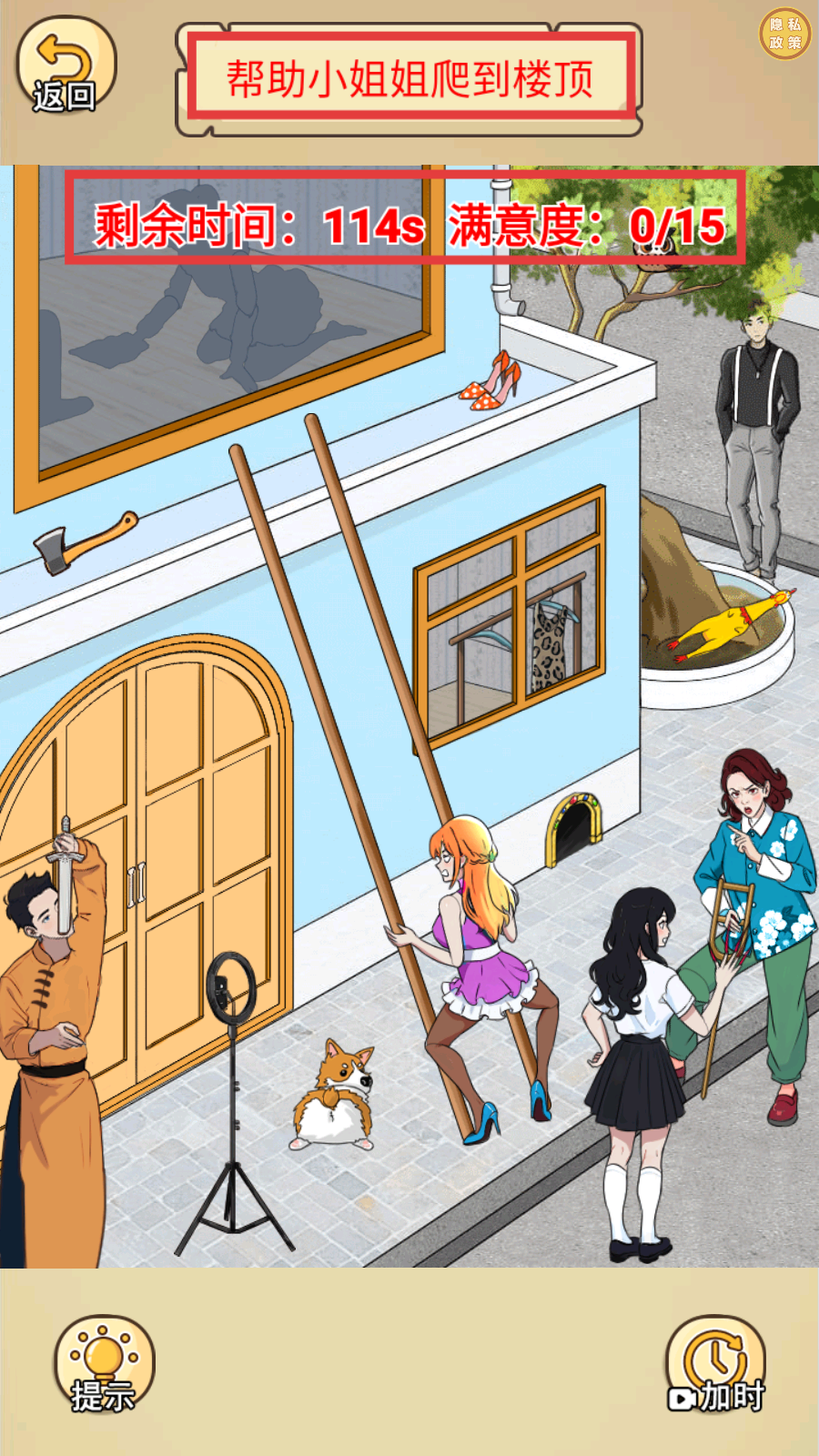 2、进入【帮助小姐姐爬到楼顶】任务,关注【剩余时间-114s】与【满意度-0/15】,规划行动。