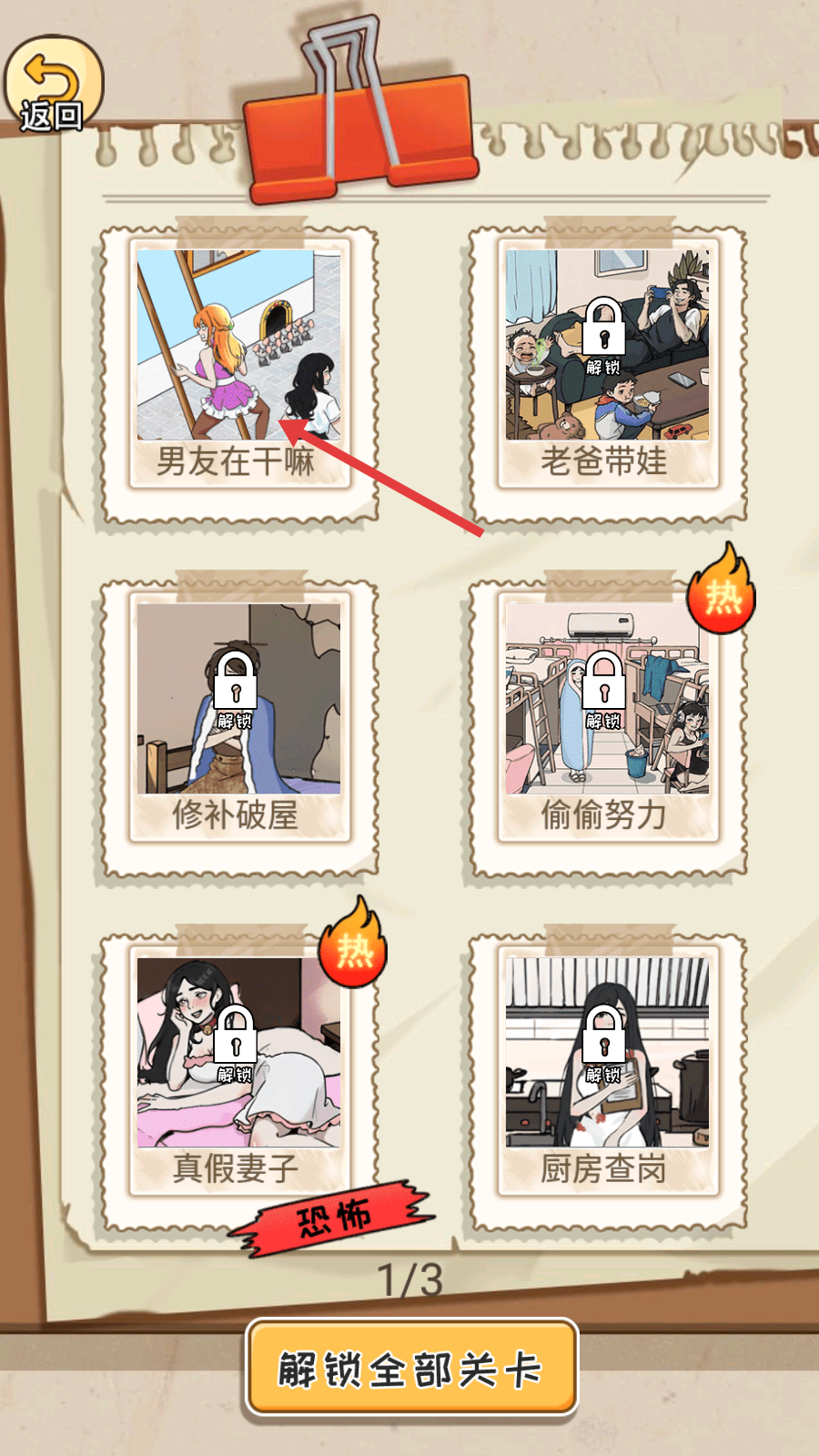 1、选择【男友在干嘛】关卡开启挑战,留意关卡解锁状态,优先推进可玩内容。