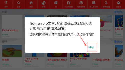 3、在菜单页面点击“继续”按钮,跳过提示,直达地图选择界面。