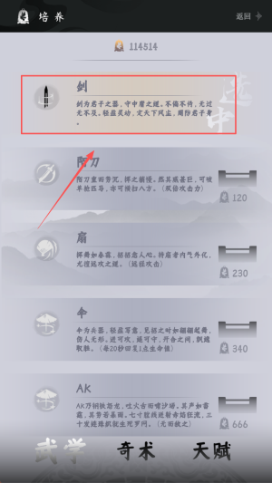 3、在角色界面,点击“培养”进入武器列表,任选一件装备后点击“返回”。