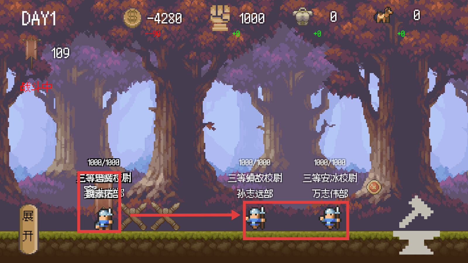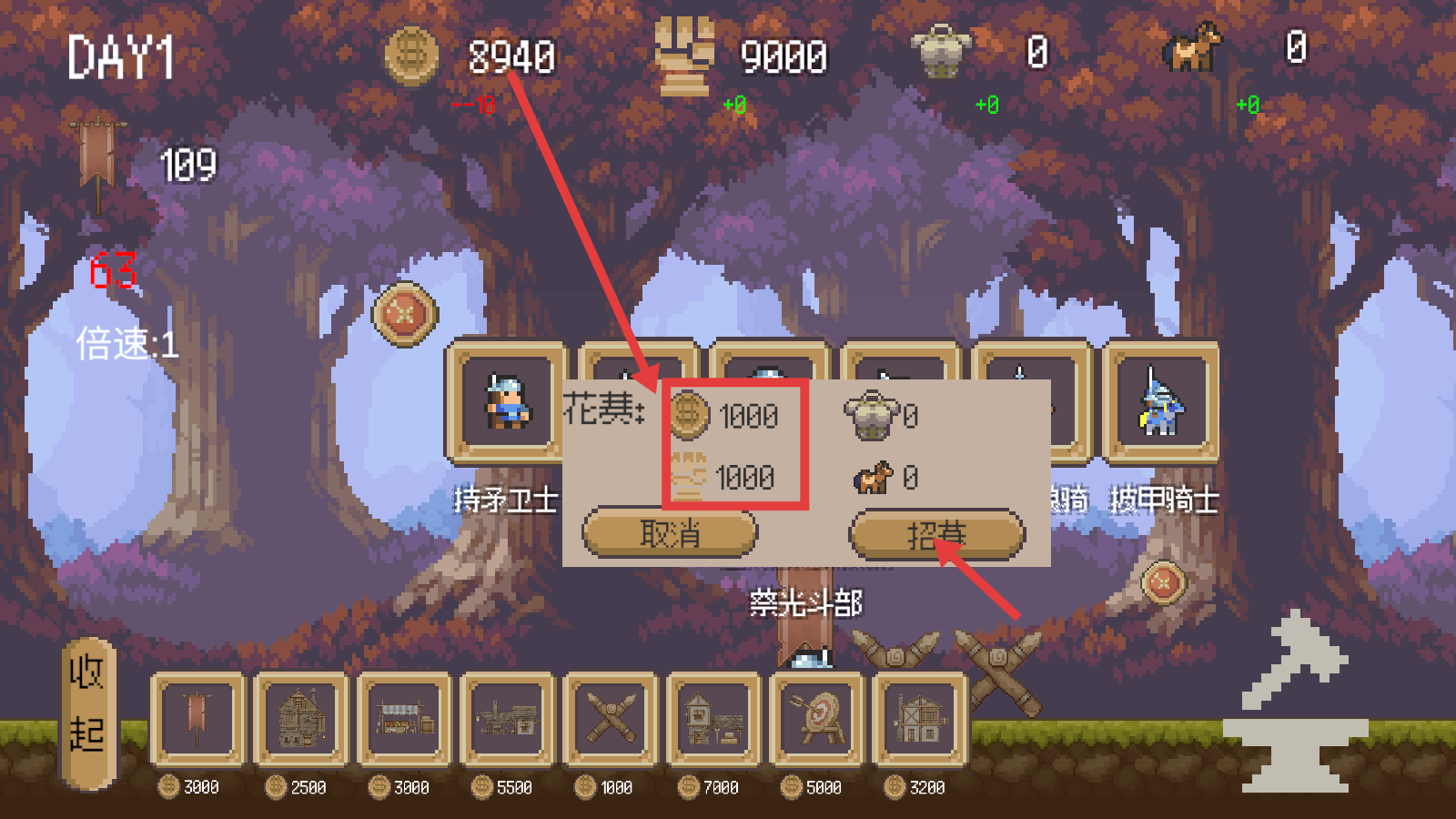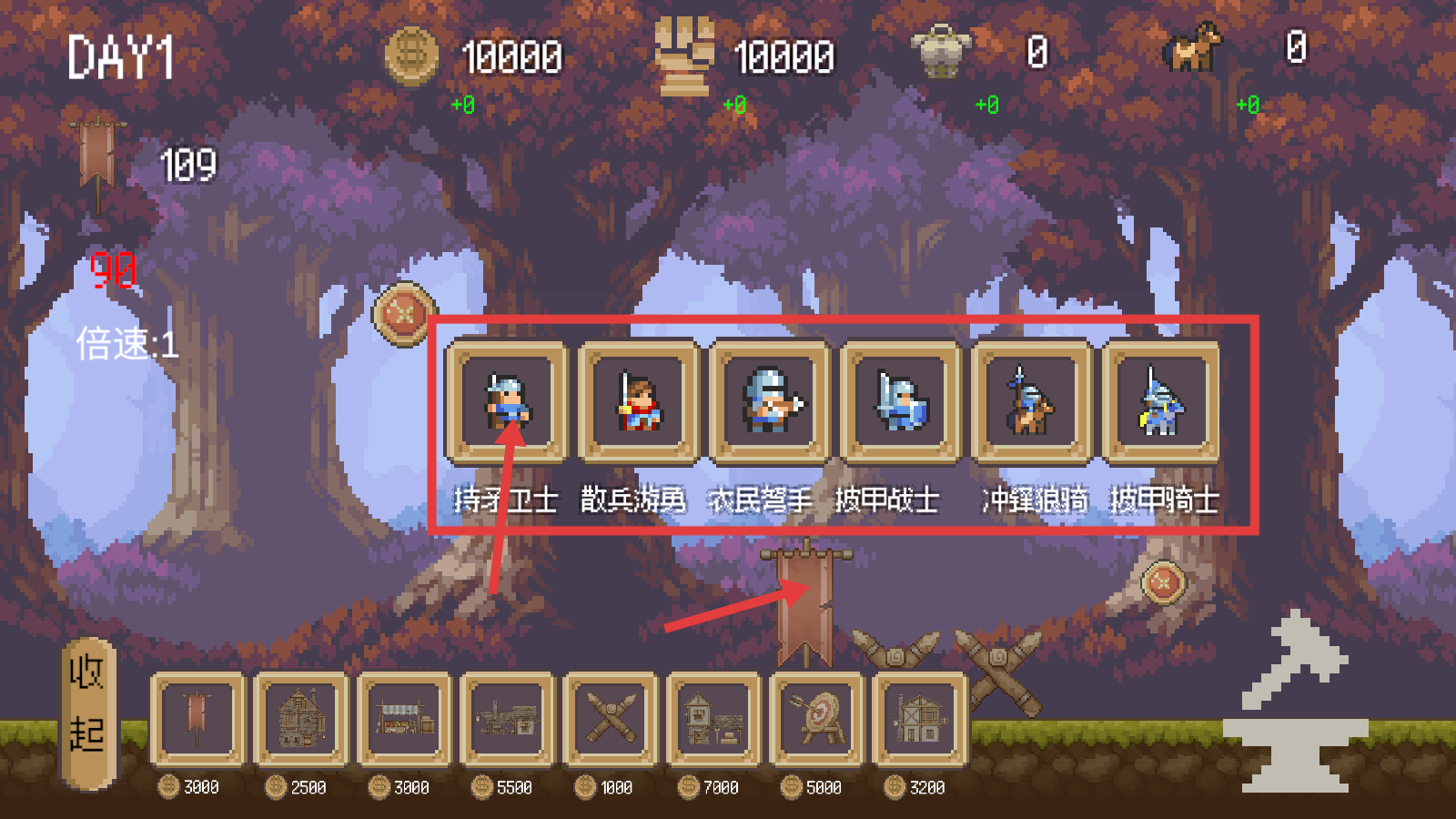1、DAY1开局,浏览【持矛卫士-散兵游勇-农民弩手】等兵种,依金币【10000】规划,构建初始战力。