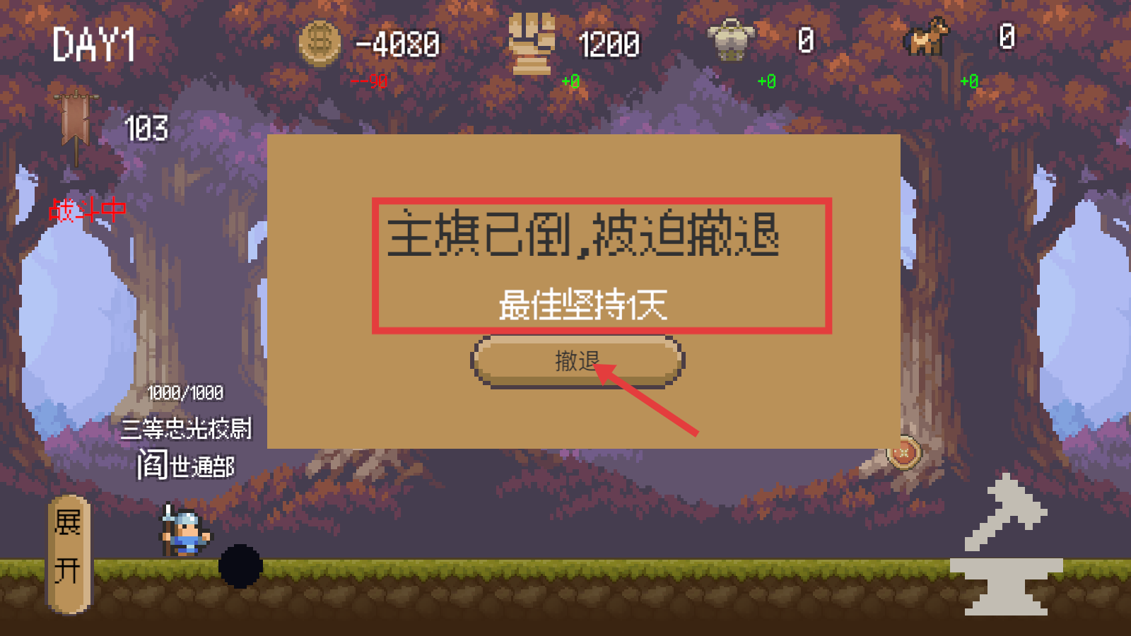 4、若触发【主旗已倒-被迫撤退】,点击【撤退】,记最佳坚持【1天】,复盘调整策略再战。