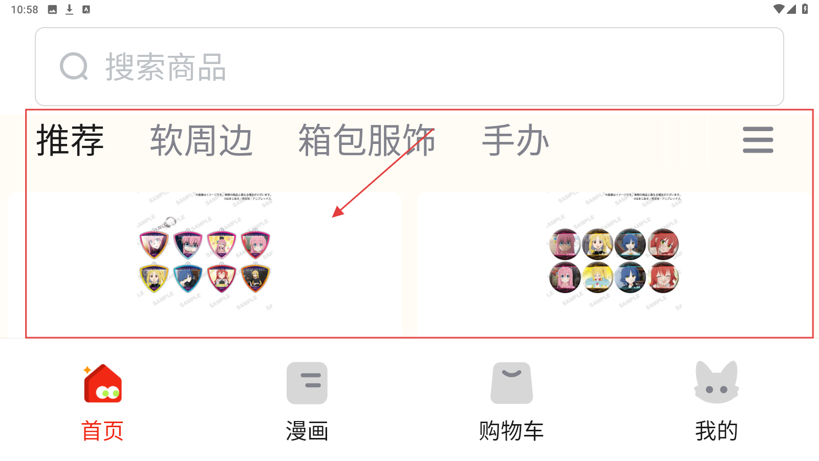 1、在首页选【推荐】类目,浏览动漫周边商品,找心仪好物。
