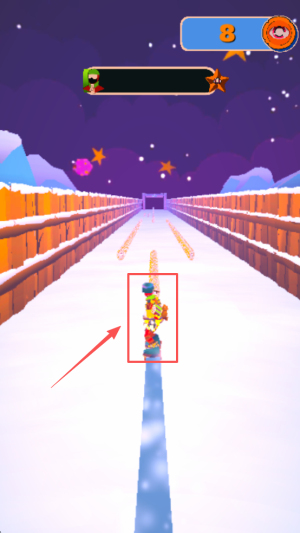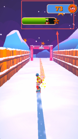 2、操控滑板冲刺:在雪景中控制滑板向前冲,灵活调整方向躲避障碍,借助地形优势提升速度,推进闯关进度。