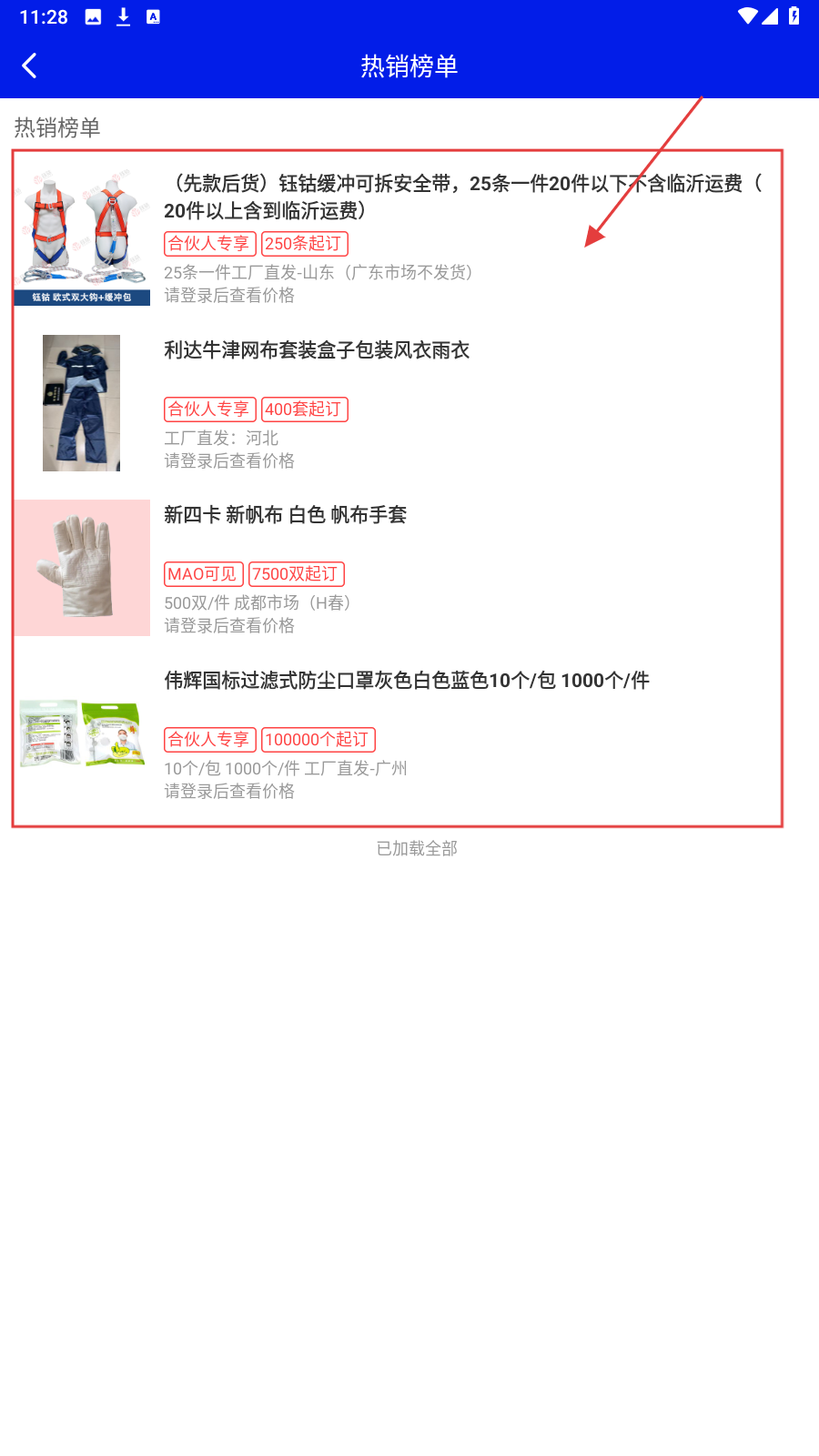 2、进入【热销榜单】,查看商品起订量、发货地等信息,筛选符合需求的劳保品。