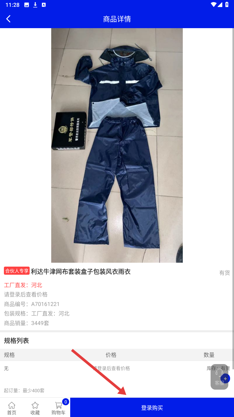 3、选中心仪商品如【利达牛津网布套装盒子包装风衣雨衣】,点【登录购买】完成采购。