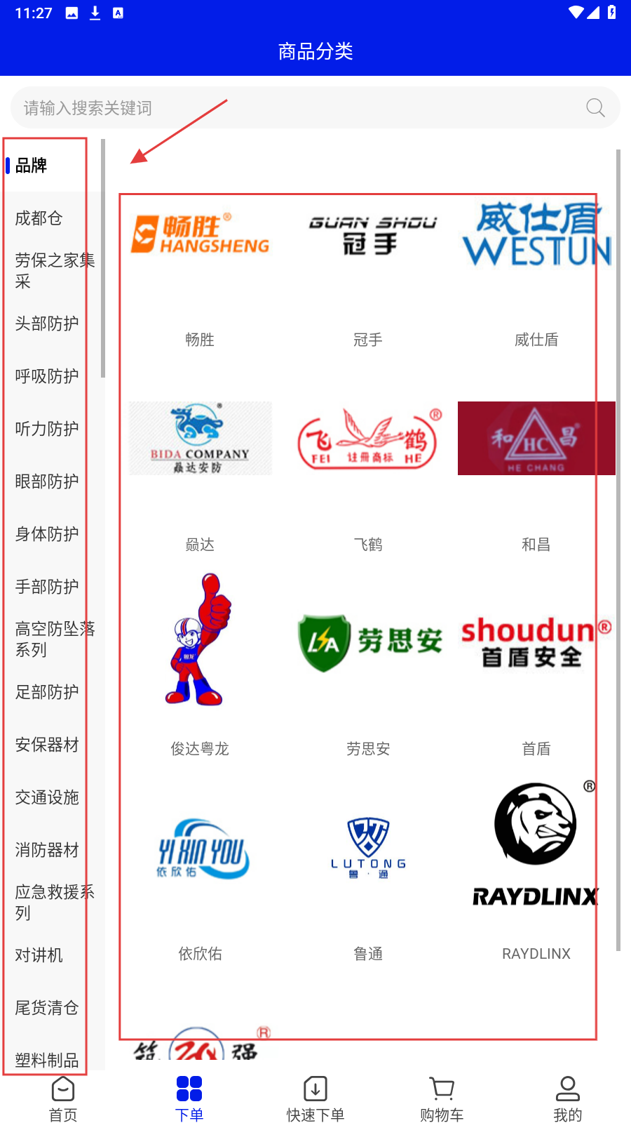 4、还可以利用【商品分类】,从左侧分类和右侧品牌选品,精准查找对应劳保品牌与类别。