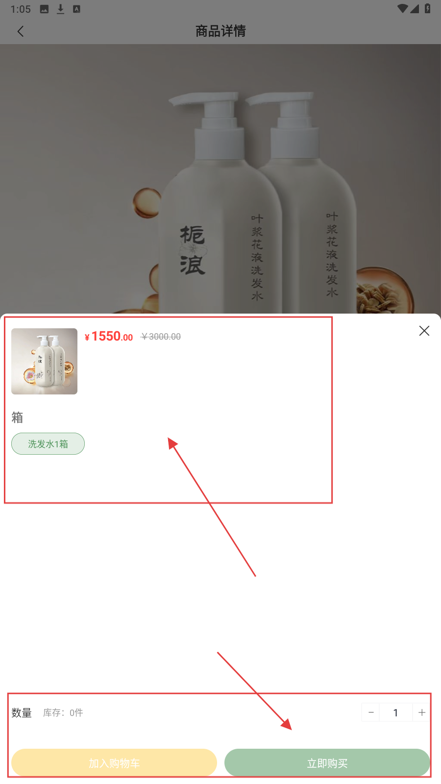 3、进入商品详情,确认“洗发水1箱”信息后,点【立即购买】推进交易。