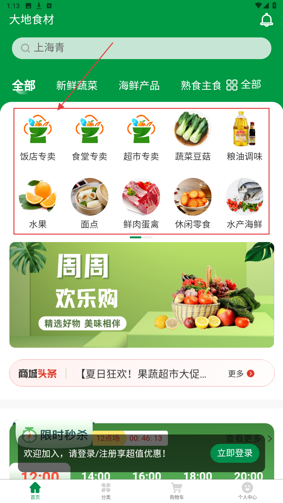 1、进入【大地食材】首页,选【新鲜蔬菜】分类下【饭店专卖】,精准找餐饮食材。