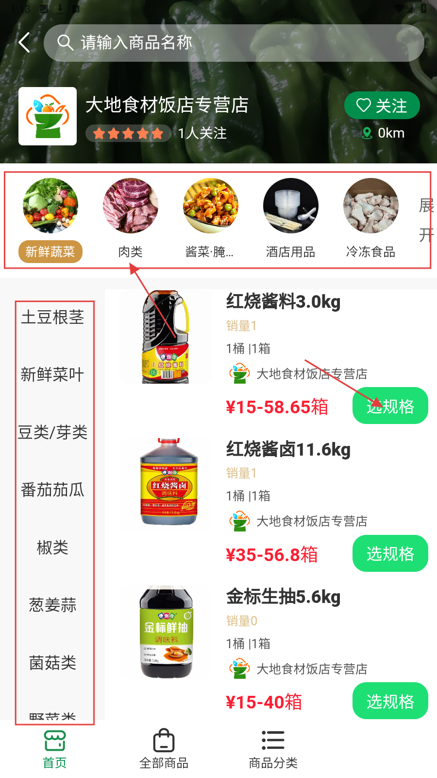 2、在【大地食材饭店专营店】,点【肉类】等分类,结合左侧蔬菜子类,快速筛商品。