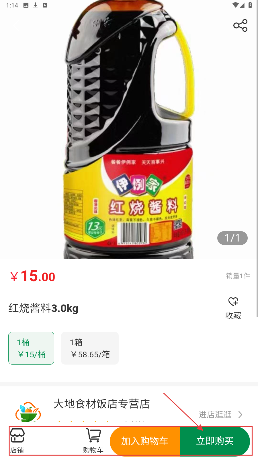 3、浏览商品详情,选好【红烧酱料3.0kg】规格(1桶/1箱),点【立即购买】。