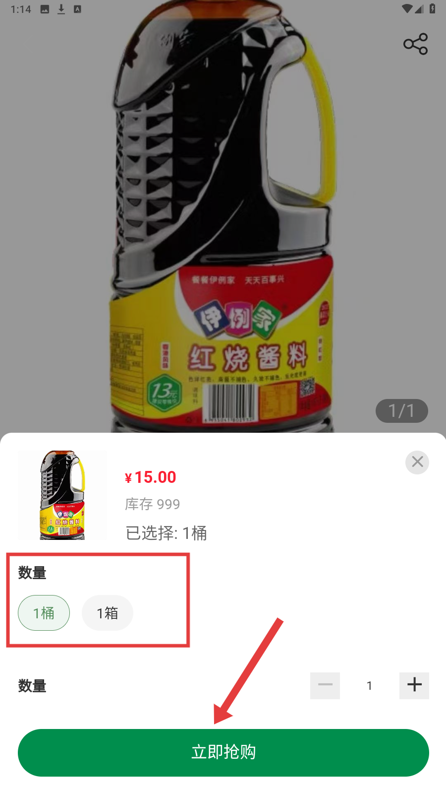 4、确认所选商品规格(1桶/1箱)、数量,无误后点【立即抢购】完成下单。