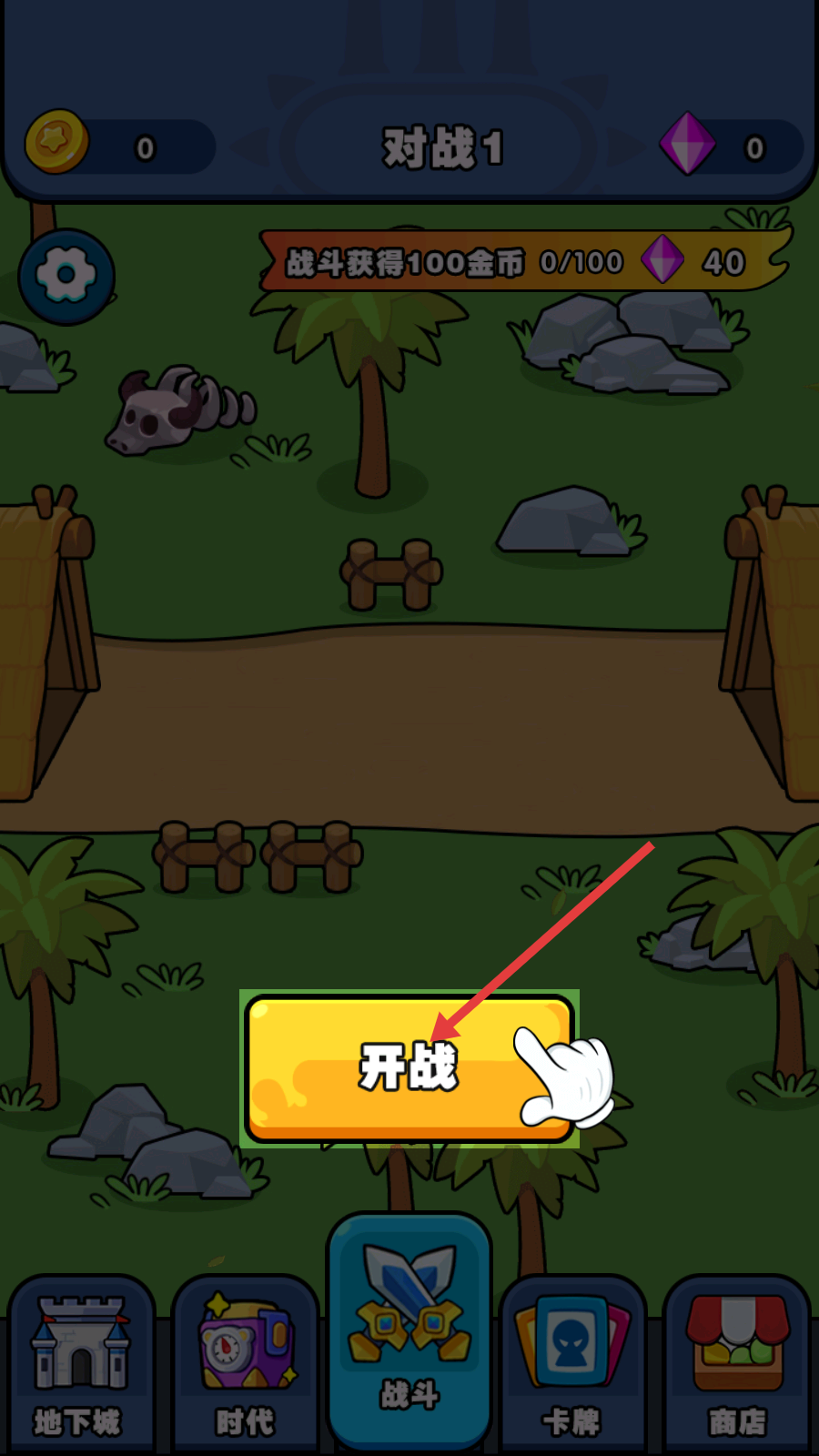 1、进入游戏先点击【对战1】界面的【开战】按钮,开启首场战斗,目标达成【战斗获得100金币-0/100】。