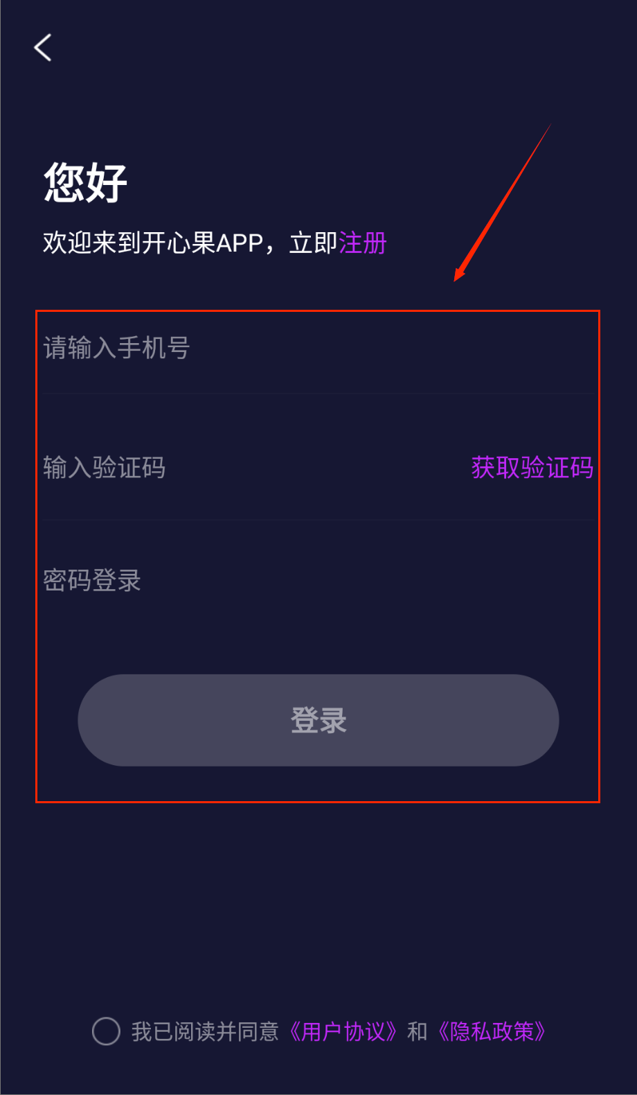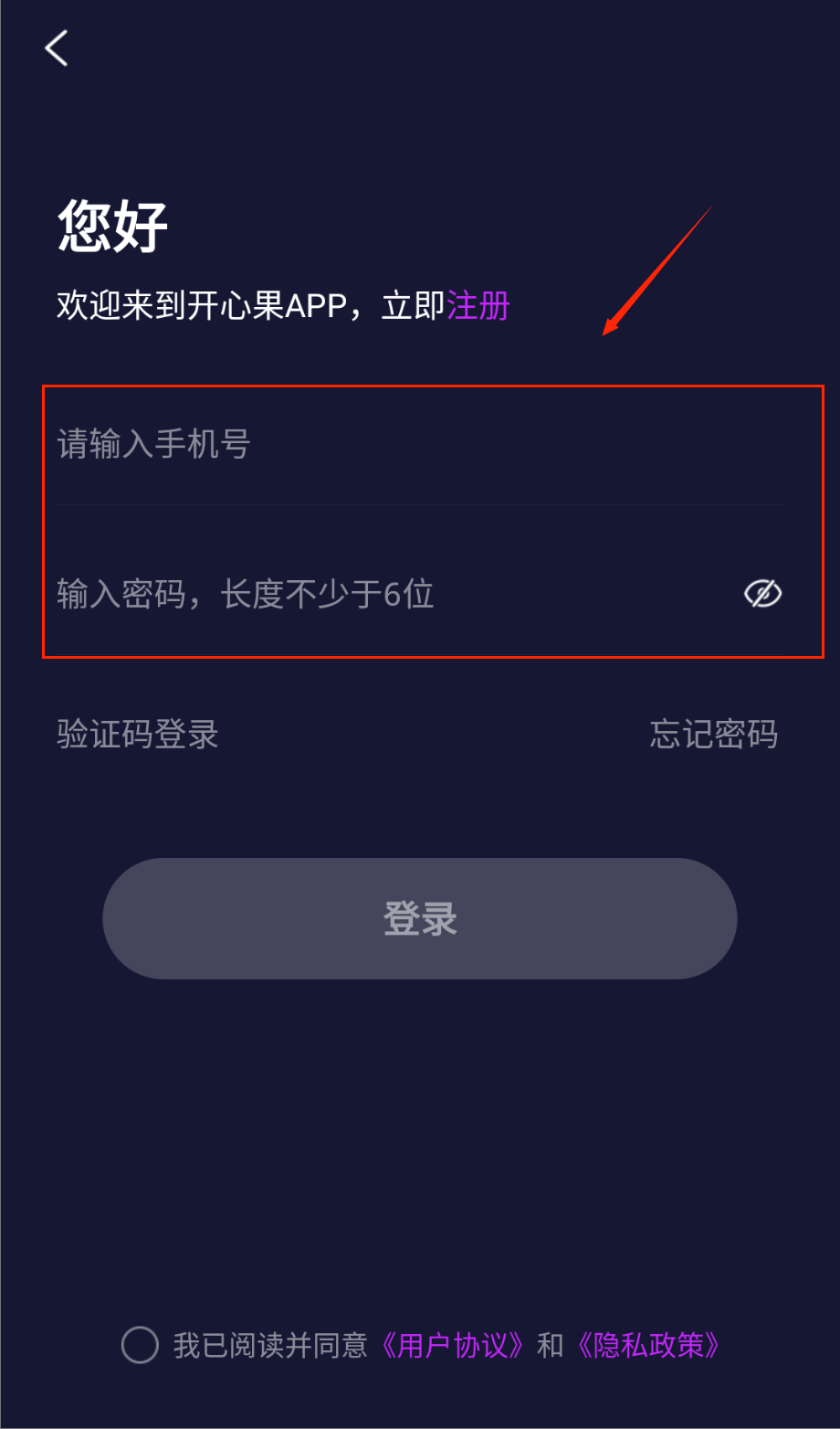 3、如果已经注册过账号,可以选择密码登录方式。在登录页面输入之前设置好的手机号和密码,注意密码区分大小写。