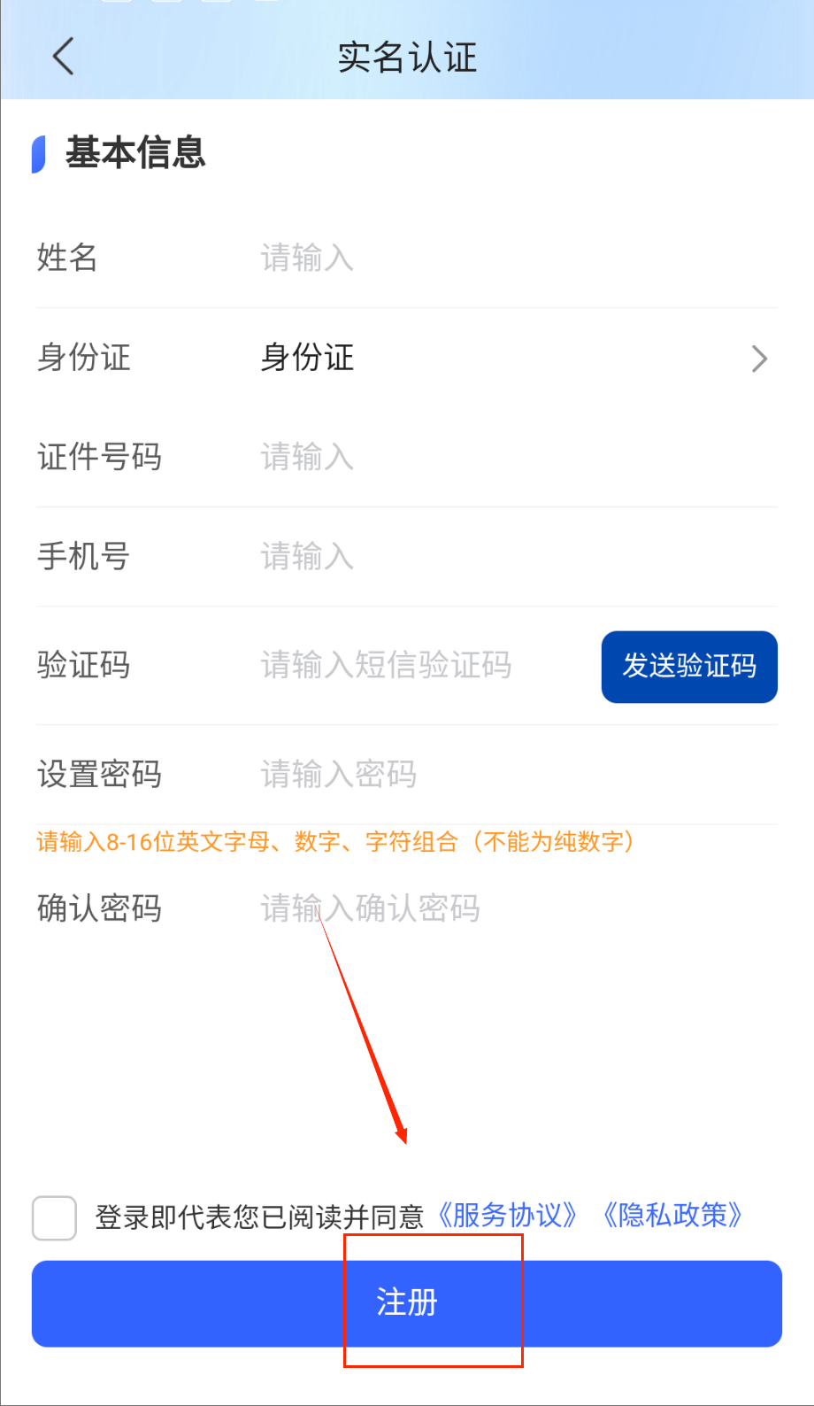 3、新用户需要先完成实名认证,要填写真实姓名和身份证号。手机验证码别忘记收取和填写,密码要设8-16位的复杂组合。