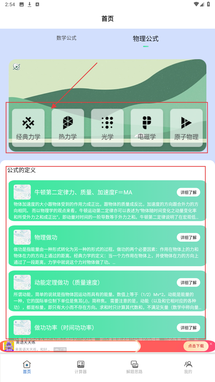 3、切换【物理公式】,点击【热力学】等分类,查看公式定义,点【详细了解】钻研应用。