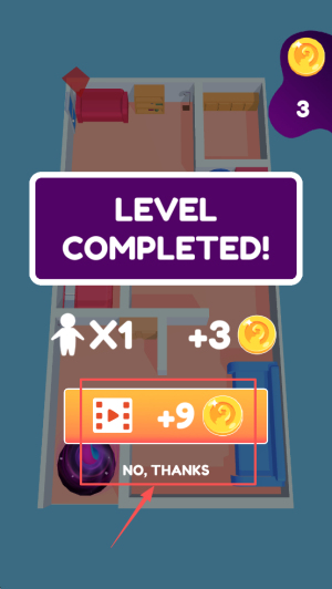 4、完成关卡后,点击“NO, THANKS”按钮,拒绝观看广告以获得额外奖励。