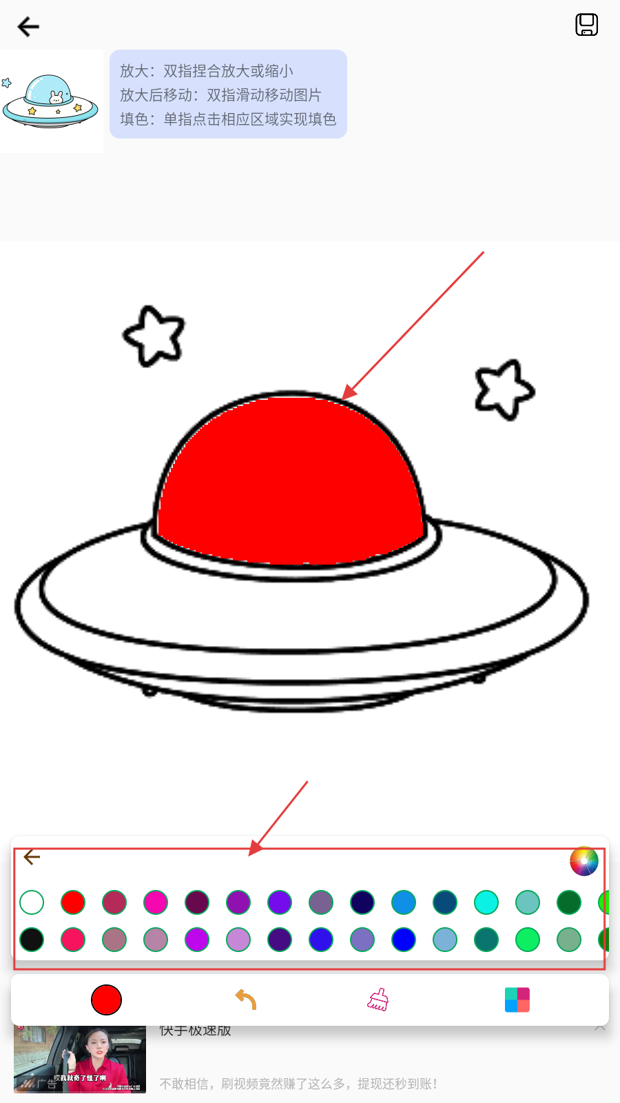 2、选好颜色(底部色盘选色),单指点击图案区域填色,双指捏合放大/缩小图案。