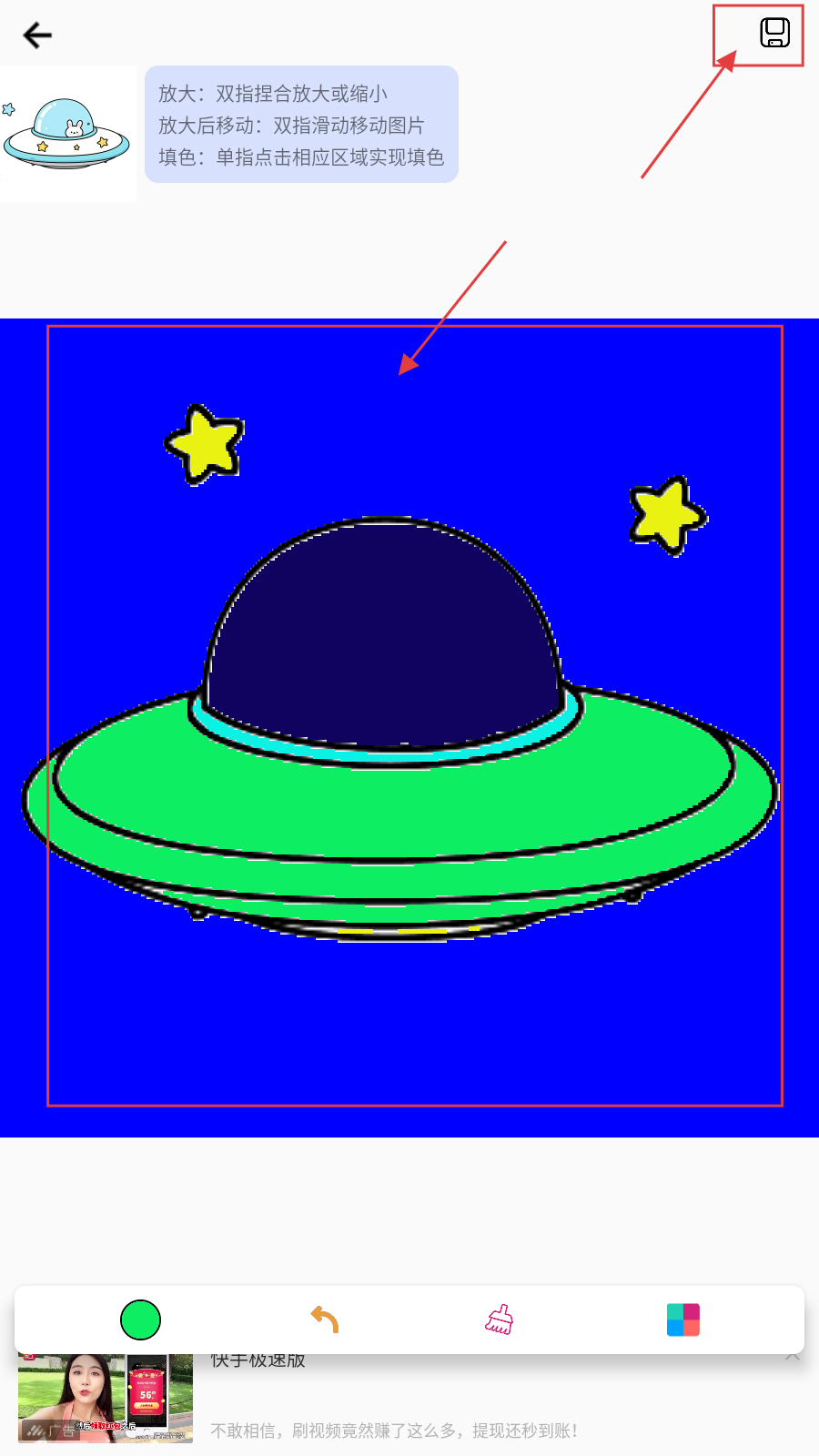 4、填色完成,点右上角保存图标,留存创作的彩色图案。