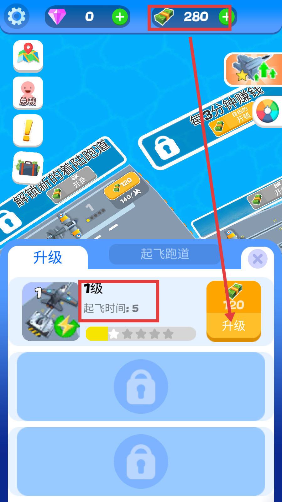 2、进入起飞跑道升级页,消耗【120-金钱】提升飞机等级,缩短【5-起飞时间】,加速收益获取。