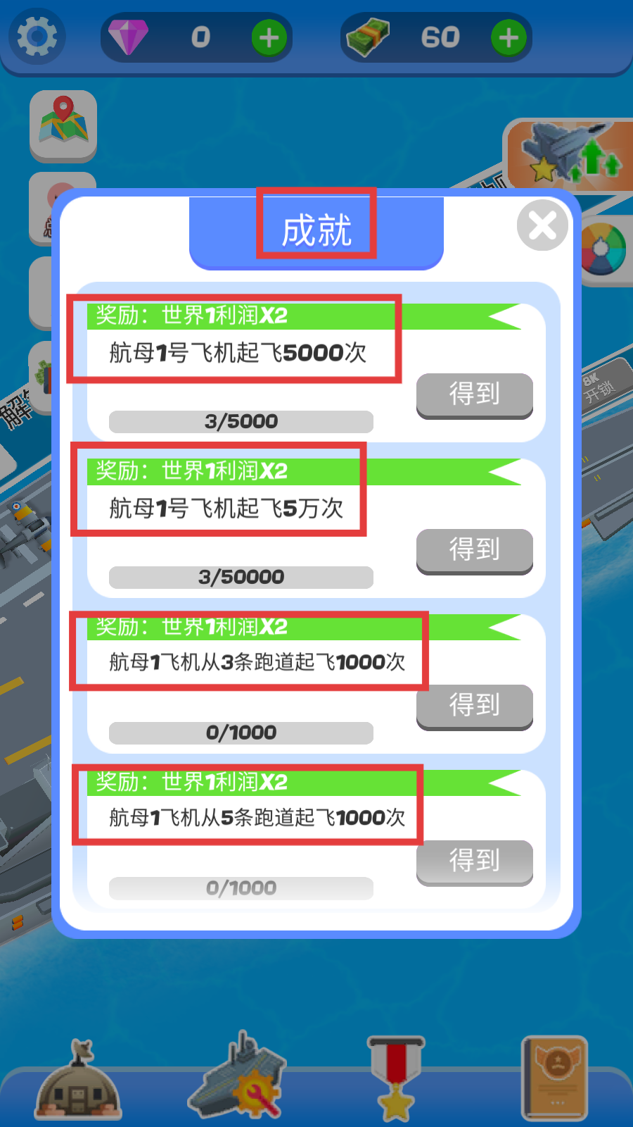 3、打开【成就】界面,瞄准【航母1号飞机起飞5000次】等目标,达成解锁【世界1利润X2】增益。