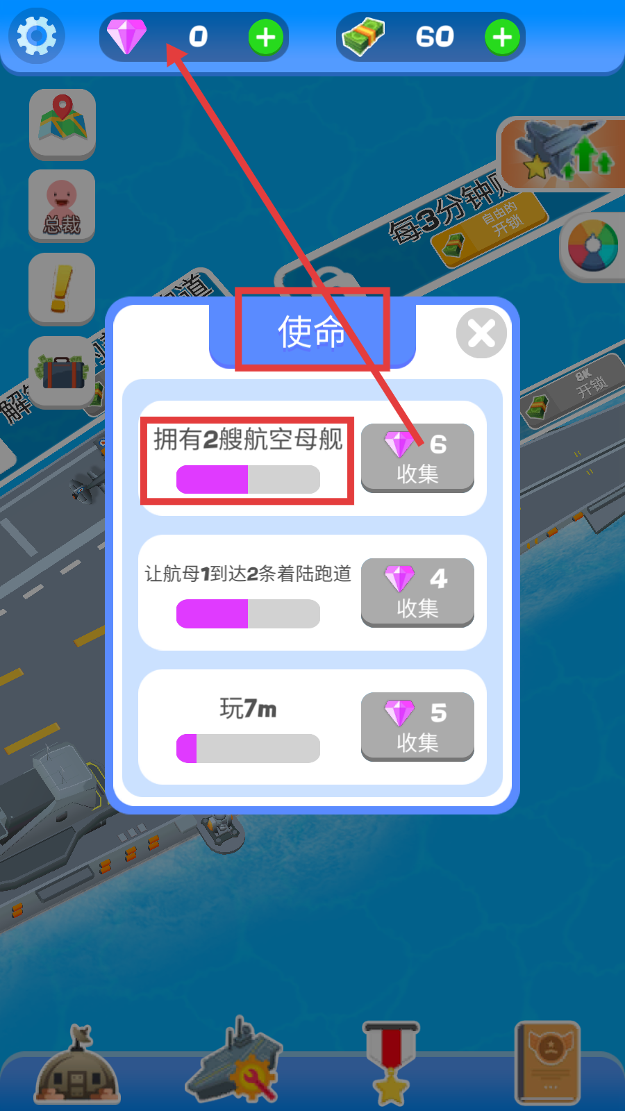 4、查看【使命】面板,完成【拥有2艘航空母舰】任务,领取【6-钻石】,用于关键升级。