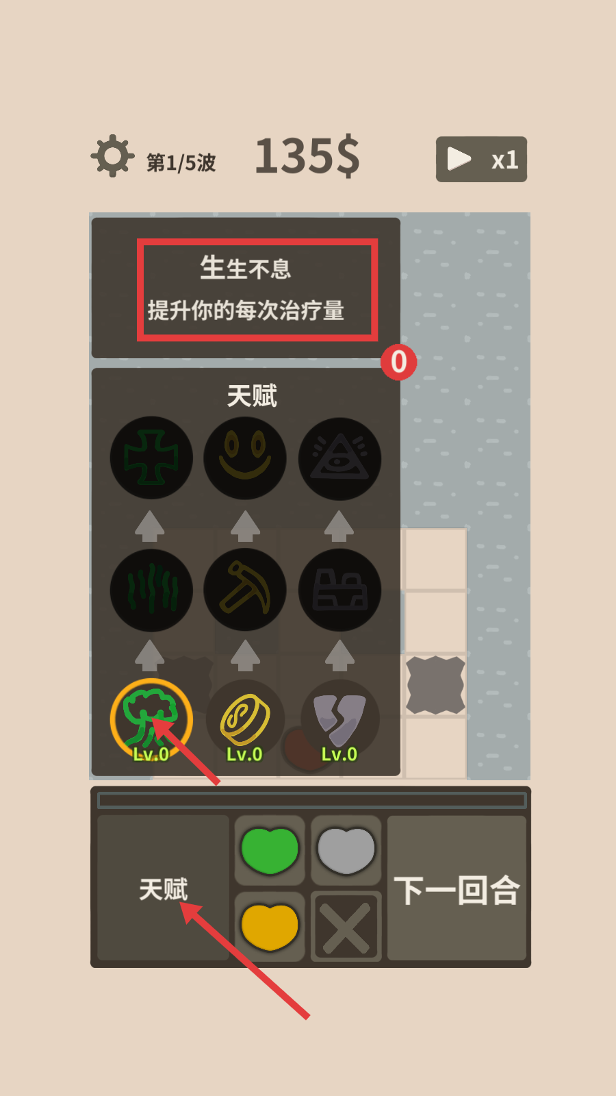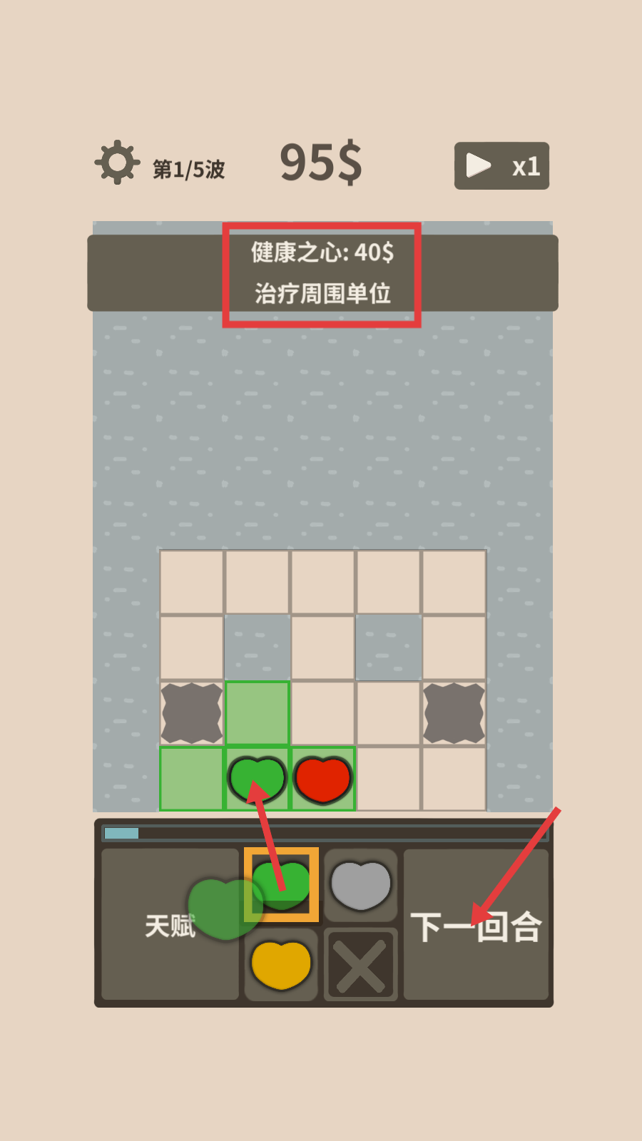 3、消耗【40$-健康之心】部署治疗单位,覆盖关键格后,点击【下一回合】推进第1/5波。