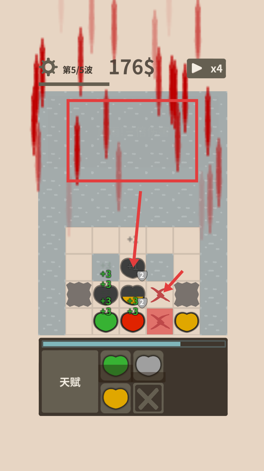 4、第5/5波应对【红色暴雨】,依托治疗单位【+3】回血,清除劣势格子,坚守撑过最终波。