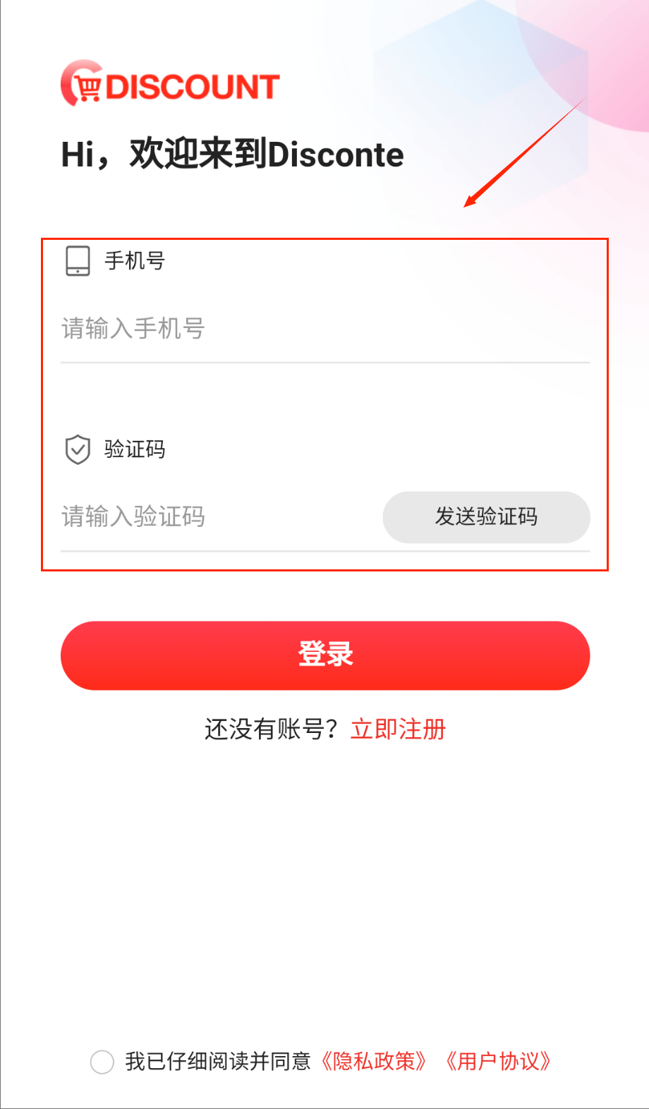 1、打开Discount软件后首先会看到非常简洁明了的登录界面,在页面中央找到手机号输入框并准确填写你的11位号码。