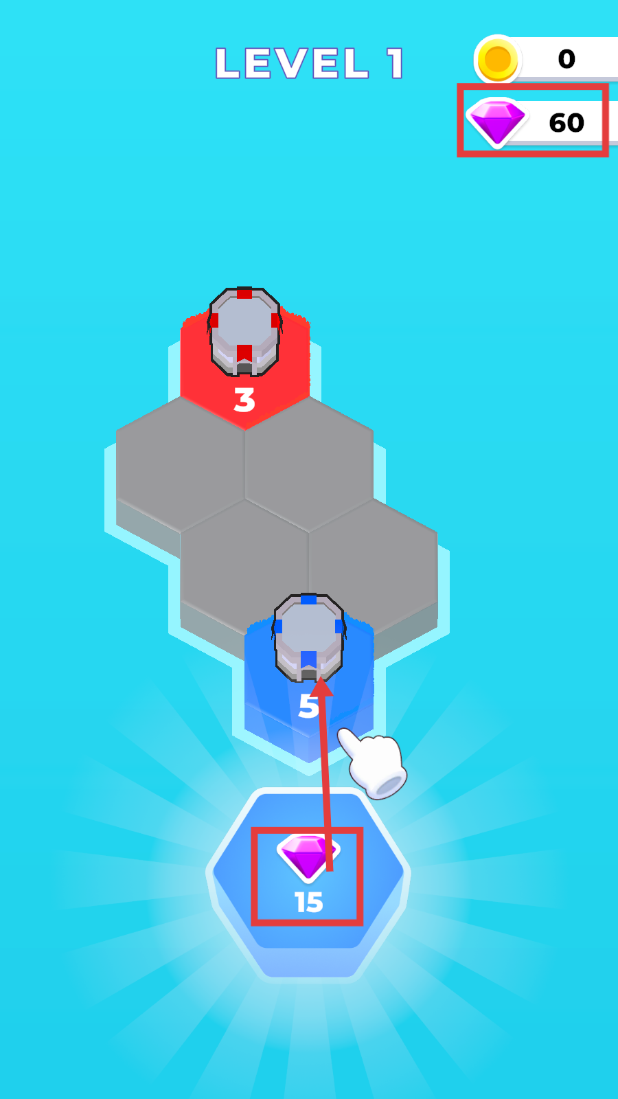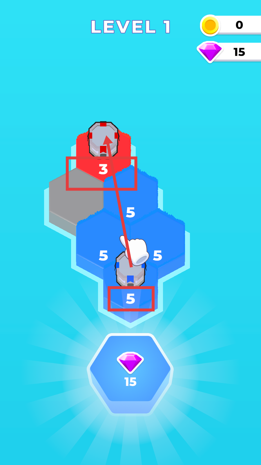 3、指挥【5-数值】蓝色单位,进攻红方【3-单位】,通过六边形格子扩张,逐步掌控战局。