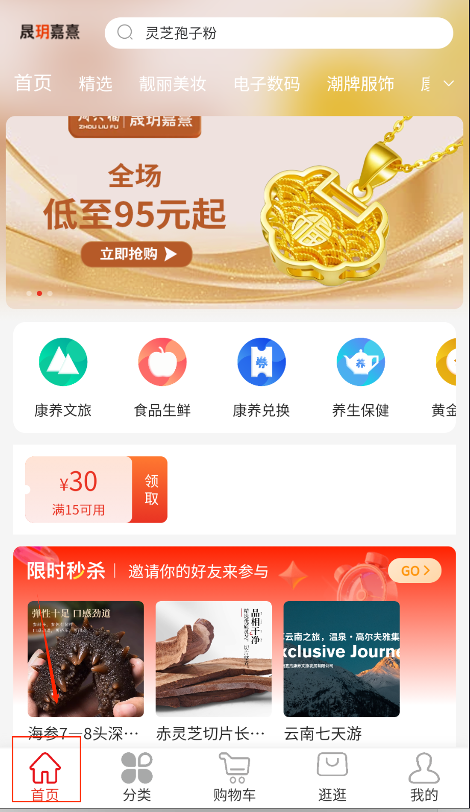 1、打开APP后首先在首页显眼位置找到限时秒杀专区入口并点击进入,仔细浏览当前正在参与活动的商品列表和每个商品的剩余抢购时间。
