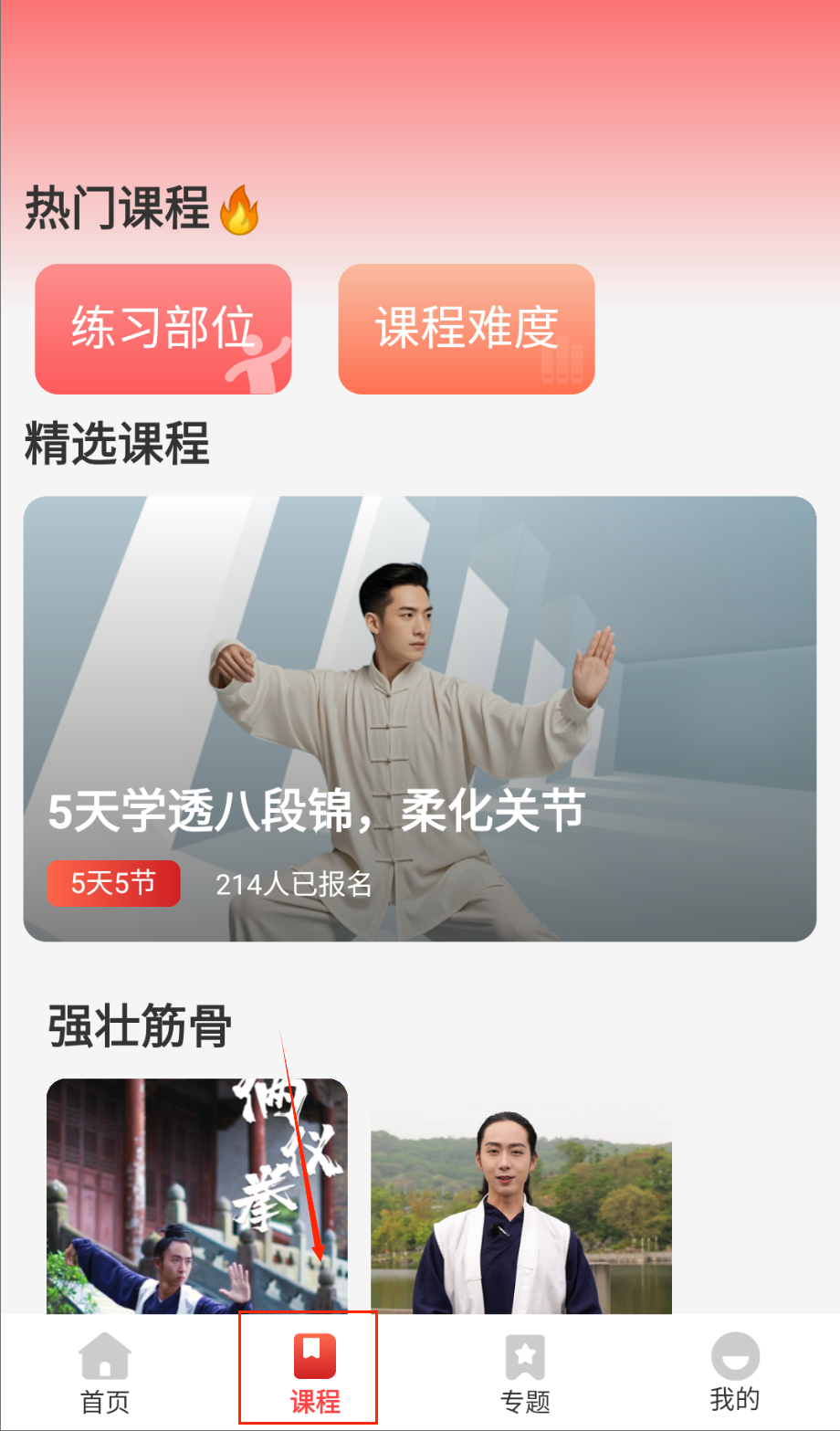 1、界面设计采用清新简洁的风格,课程按照难度等级和功法类型有序分类排列,初学者也能快速找到适合自己的教学内容。