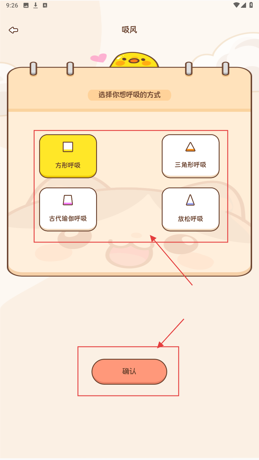 2、在吸风页面,选呼吸方式(如方形呼吸),点【确认】,跟随引导做呼吸。