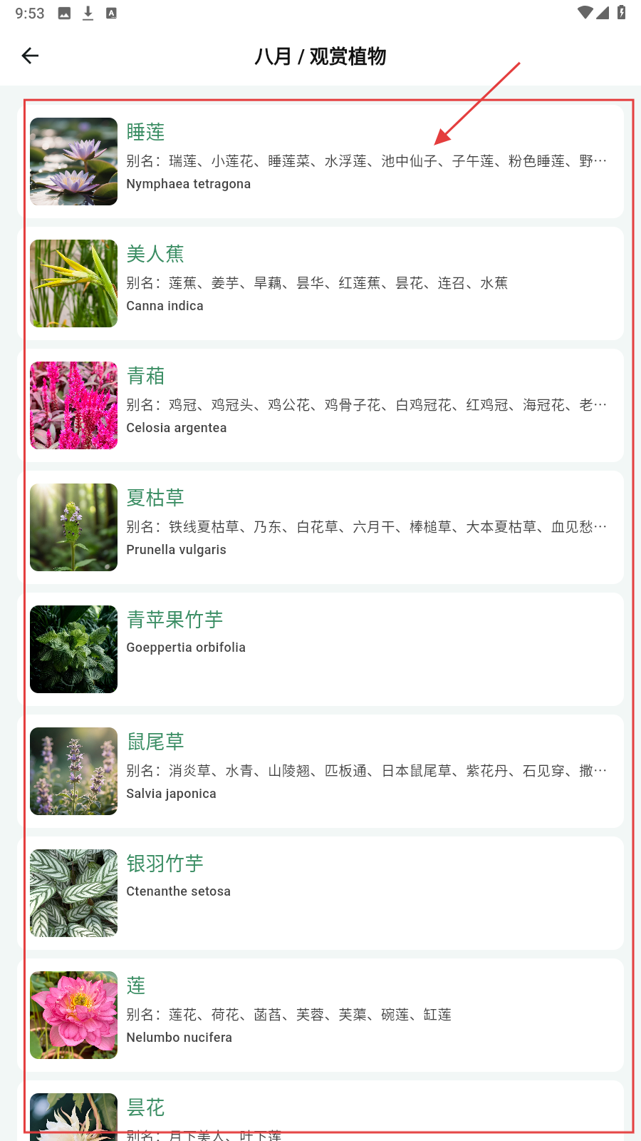 2、查看植物详情,点对应植物条目,进入了解别名、拉丁名等信息。