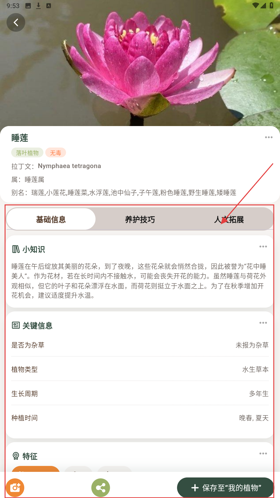 3、研究睡莲,进入详情后切【人文拓展】,获取小知识-关键信息。