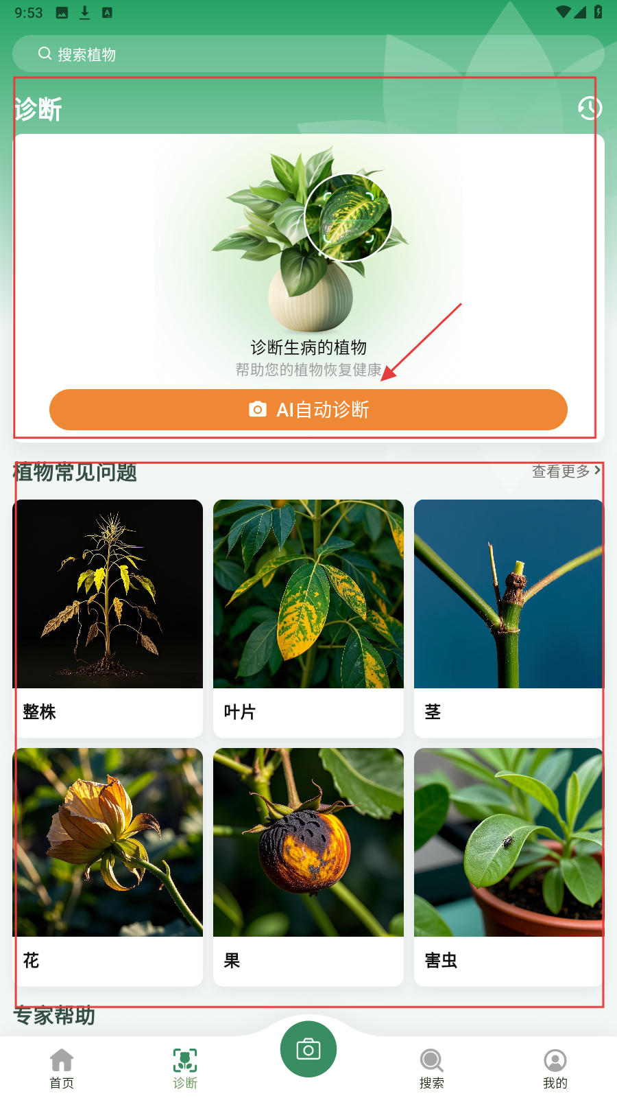 4、植物生病点【诊断】页【AI自动诊断】,或从常见问题找对应症状。