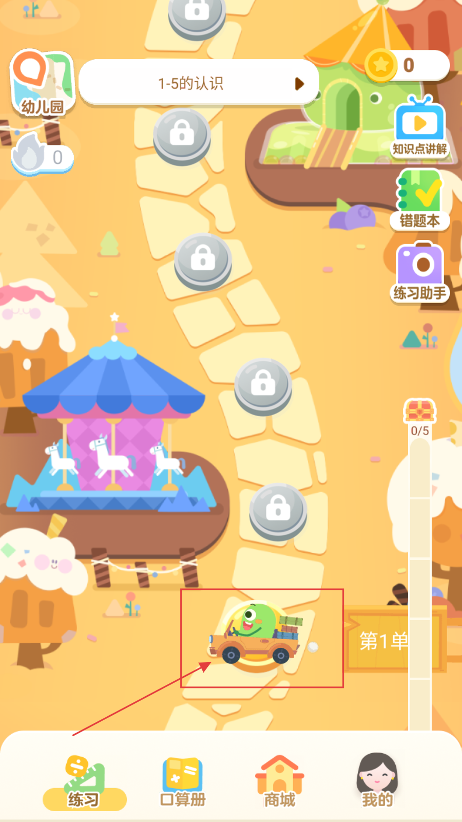 1、在【练习】页,找到对应小车标识,点击进入【1-5的认识】关卡,开启学习。