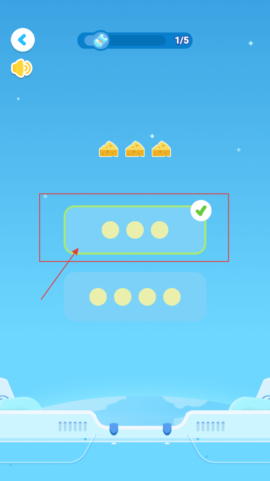 3、选与【奶酪】数量一致的【黄圆】区域,正确则显示绿色对勾,继续下一题。