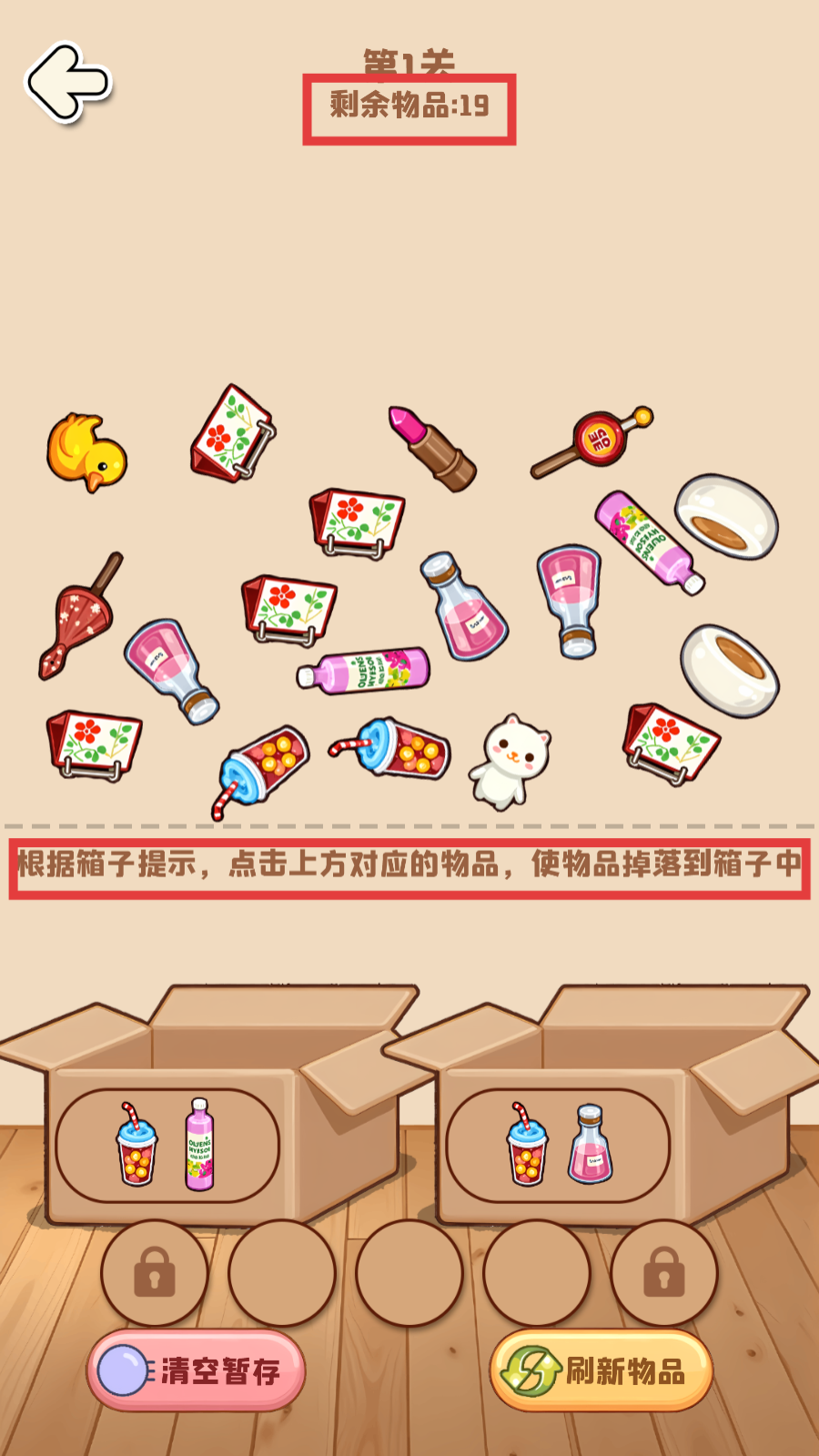 2、第1关留意【剩余物品-19】,根据箱子内物品样式,点击上方对应道具,启动分类收集。