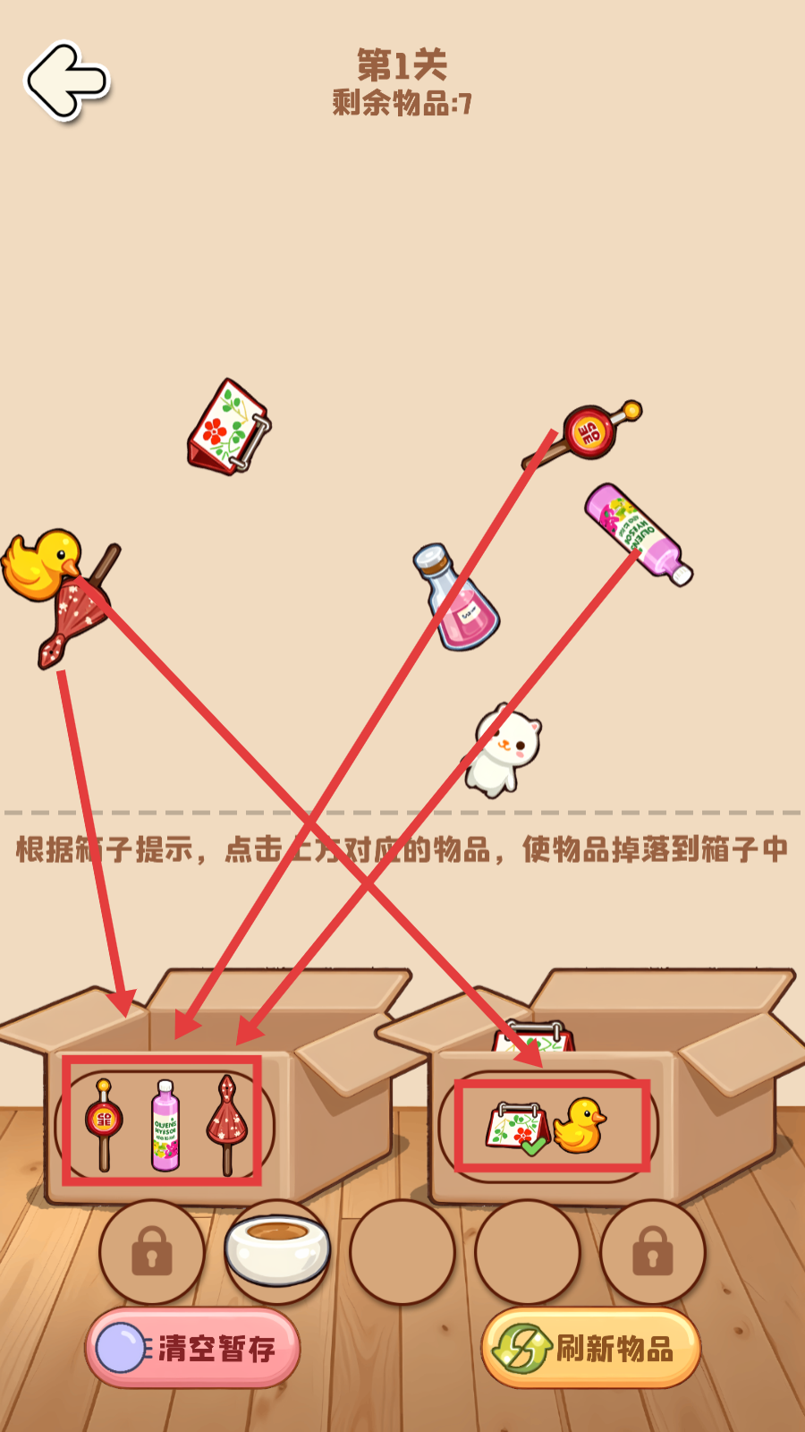 4、基本操作流程:进入游戏后点击关卡开始,根据箱子提示点击上方对应物品,让物品掉落到箱子中,完成整理任务。