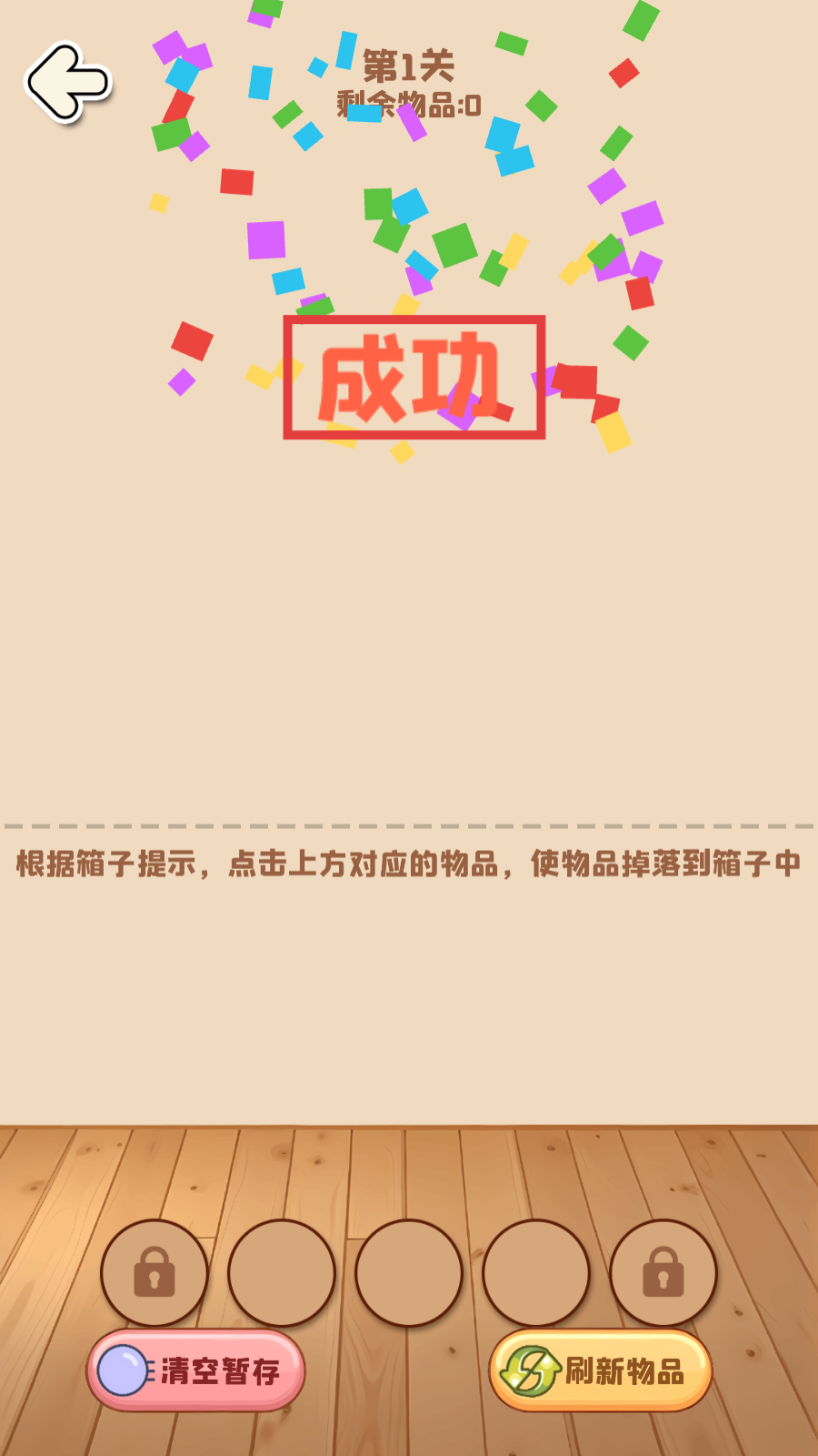 4、将物品按箱子提示全匹配,使【剩余物品-0】,达成【成功】,顺利通关第1关。
