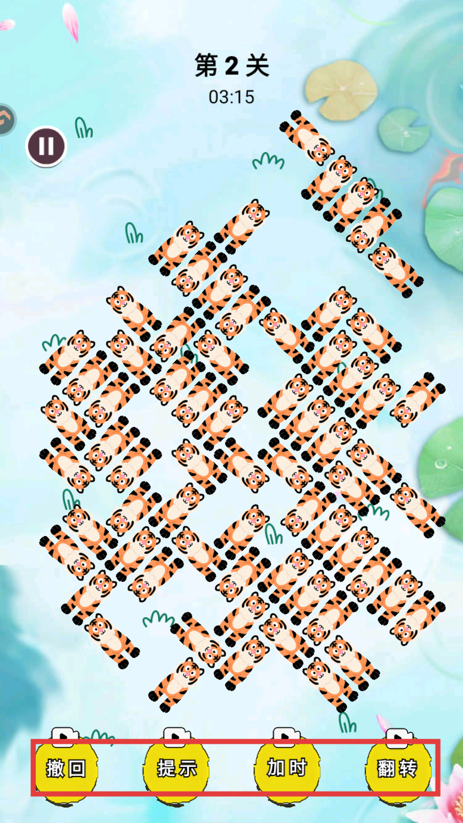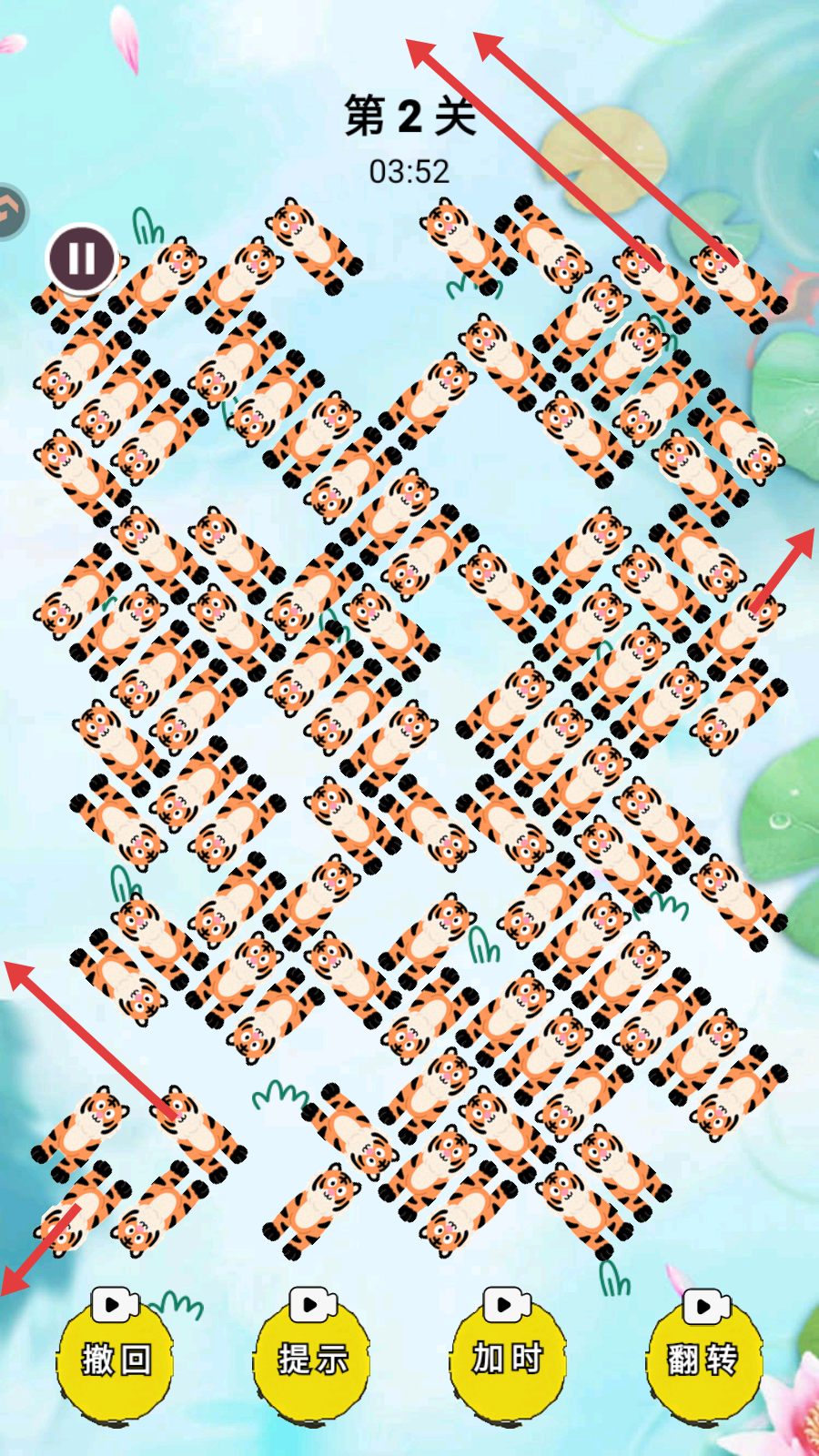 2、进入【第2关-03:52】,观察老虎图案布局,将外围的老虎点击通行进行消除。