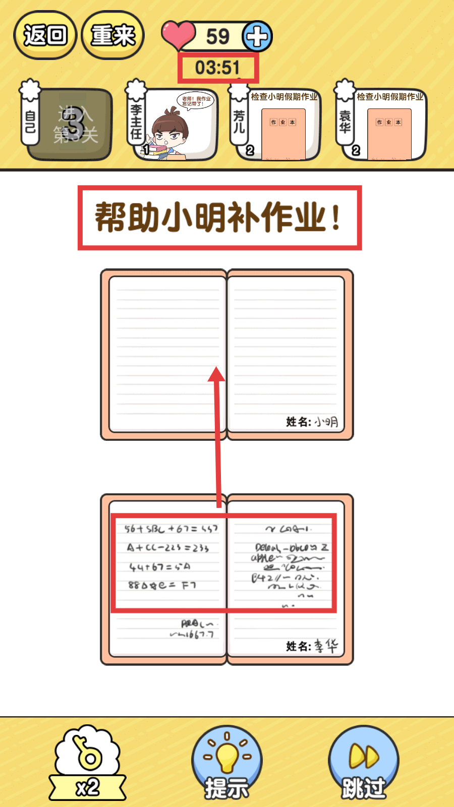 2、在补作业环节,将【李华作业本】内容拖动到【小明作业本】对应位置完成填充。