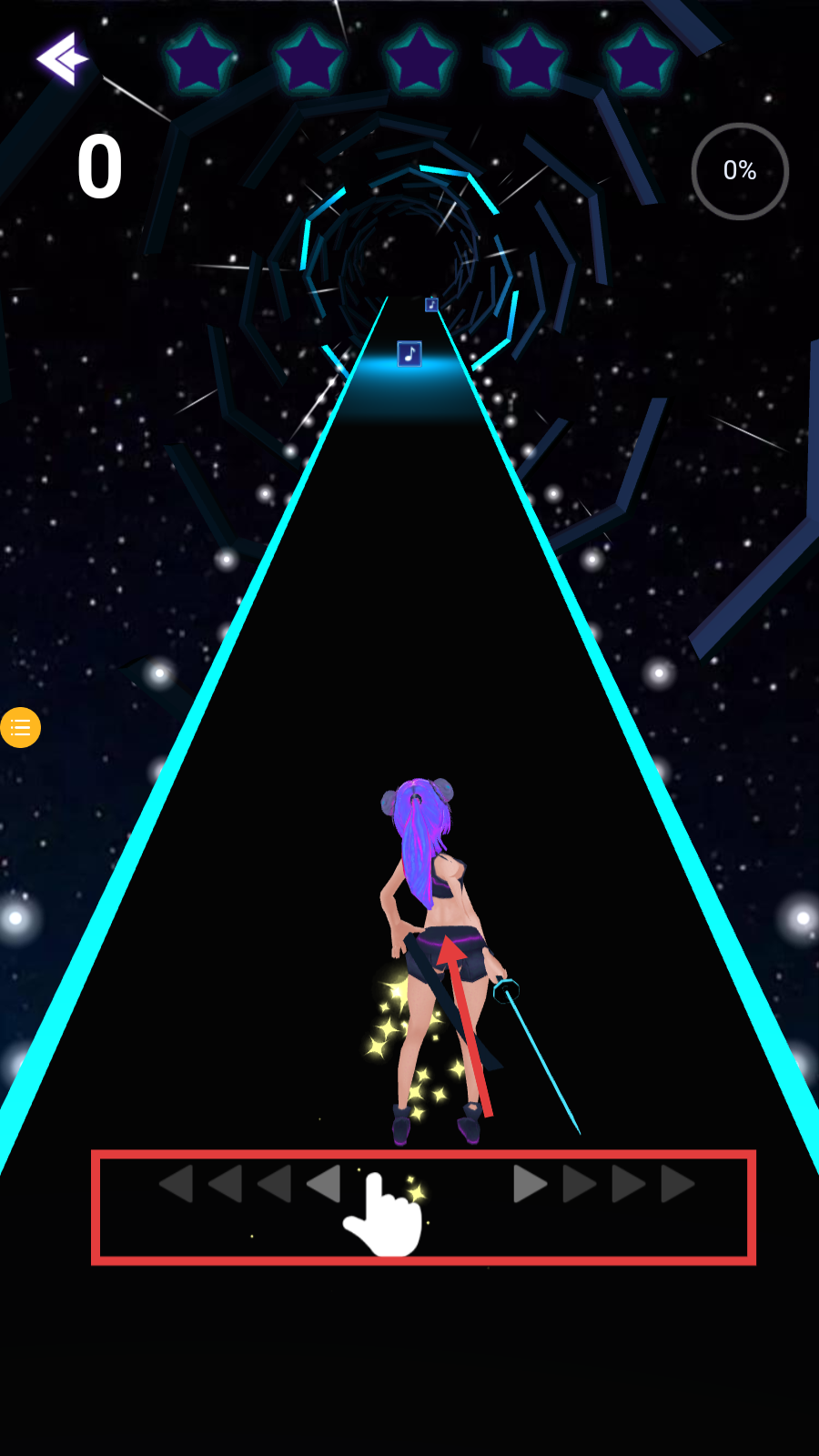 1、游戏开始前,滑动底部箭头调整角色初始位置,对准音符轨道。