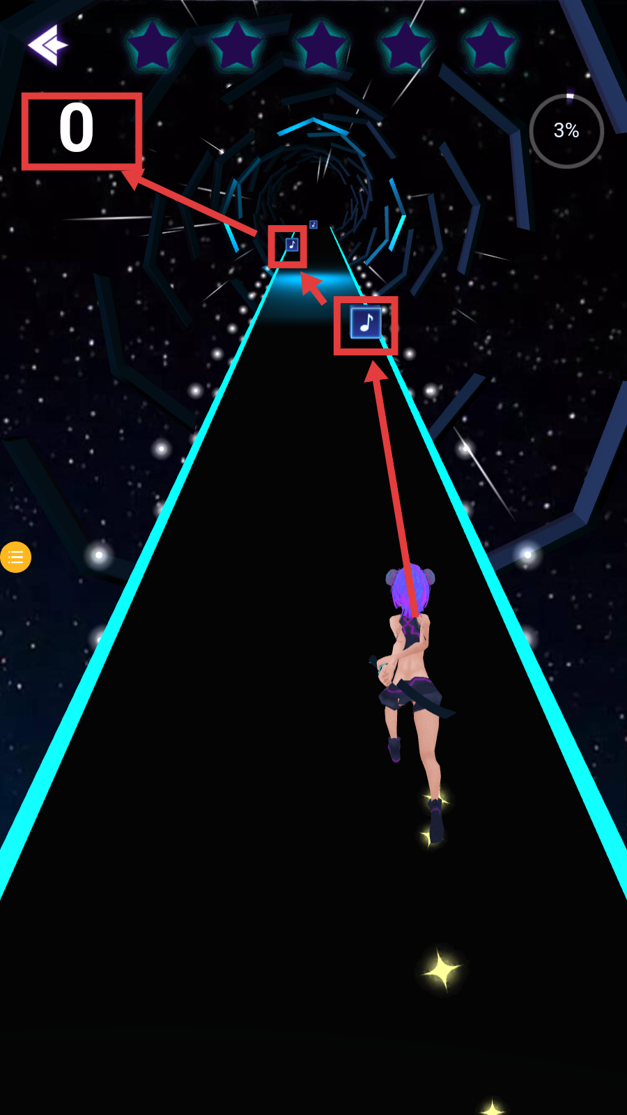 2、沿轨道前进时,操控角色躲避障碍,精准收集【音符方块】,别让计数归0。