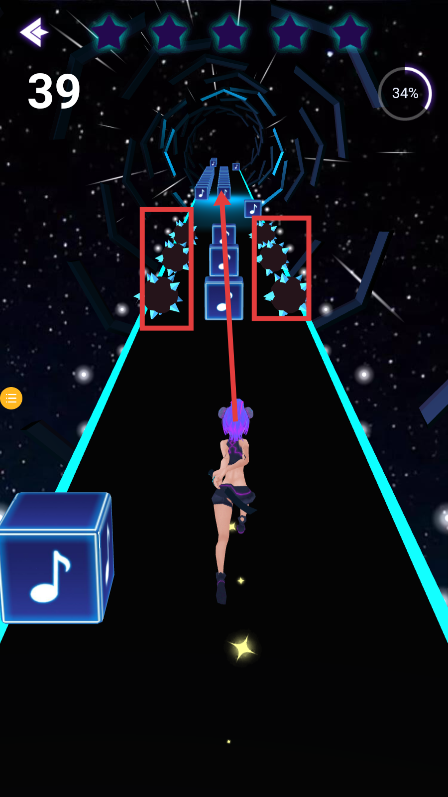 3、遇到两侧带刺障碍,保持角色在中间轨道,专注收集正向音符。