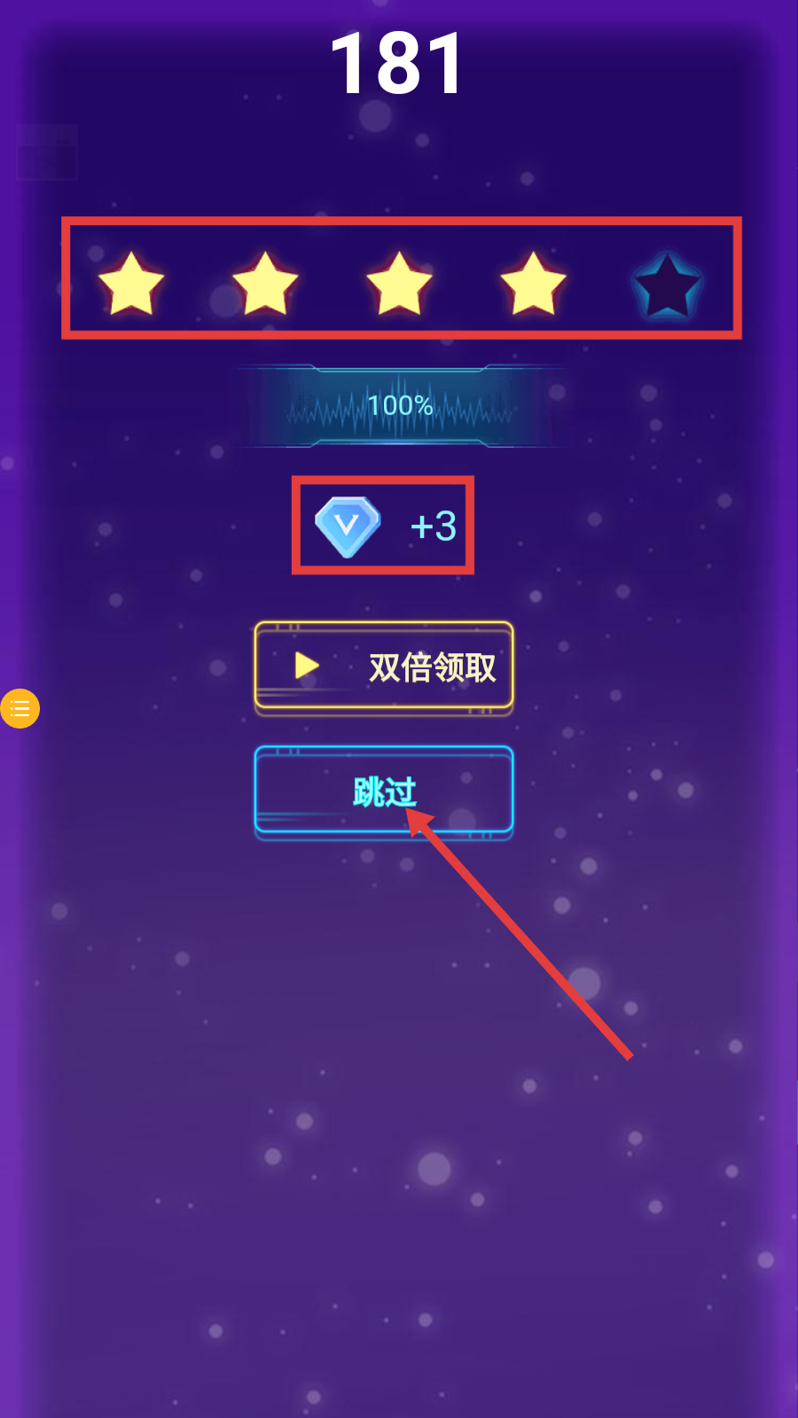 4、通关结算界面,点击【跳过】快速领取钻石奖励,继续挑战新关卡。
