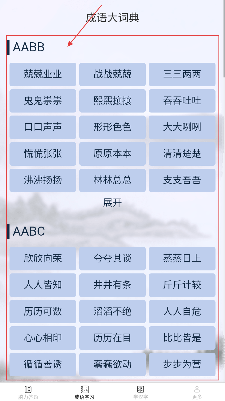 3、切换【成语学习】,浏览【AABB】等格式成语,选成语深入学习。